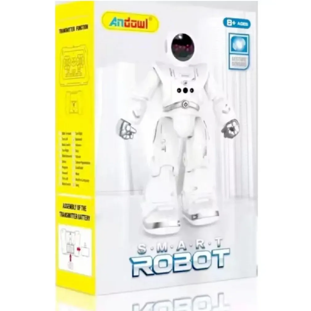 Smart Bot è ricco di funzioni, puoi controllarlo in 2 modi attraverso l’apposito teleomando ad infrarossi oppure tramite il controllo a gesti, muovi la mano in avanti per fare avanzare il robot, posizionala di fronte per farlo andare indietro, muovila a destra/sinistra per farlo ruotare. Può eseguire fino a 50 azioni programmabili, buo ballare e parlare con la sua voce robotica, i suoi occhi con led possono esprimere diverse espressioni facciali, ha 2 modalità di movimento, può camminare e scivolare e la velocità di movimento e il volume sono regolabili.