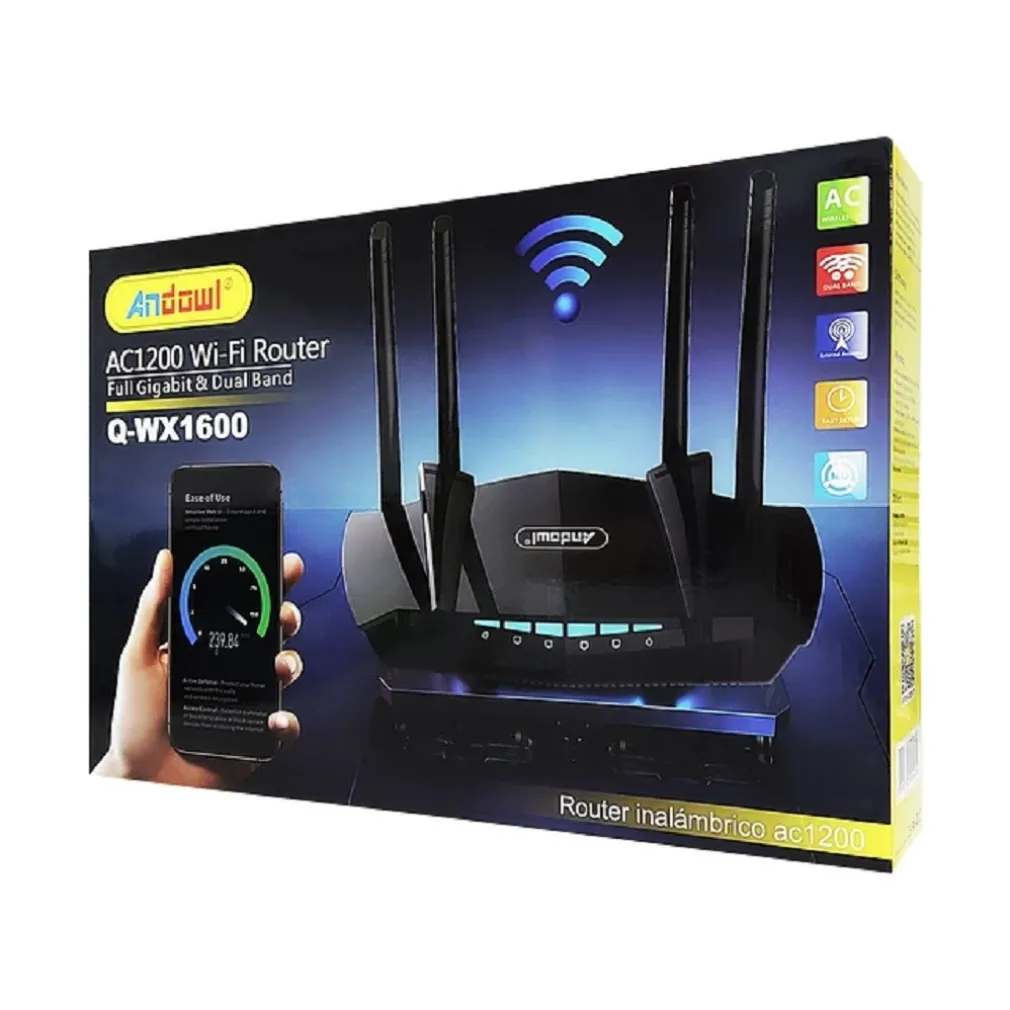 Con il router wireless Wi-Fi Andowl Q-WX1600 router, puoi connetterti al segnale Wi-Fi in modalità wireless, rapidamente e facilmente; per lavorare e/o divertirsi navigando. L’Q-WX1600 è un router, un dispositivo a cui sono collegati altri dispositivi (ad es. computer, telefono cellulare, TV), in modalità wireless o via cavo, a cui condivide l’accesso a Internet. Devi essere connesso a un modem per accedere a Internet. È la generazione Wi-Fi 5, lo standard Wi-Fi più diffuso, in grado di soddisfare le esigenze della maggior parte degli utenti al momento. Ora c’è il Wi-Fi 6 di nuova generazione che offre la possibilità di connettere molti più dispositivi per servire il numero crescente di dispositivi intelligenti in una casa. Emette un segnale a due frequenze, 2,4 e 5 GHz. Offre velocità maggiori rispetto alle singole bande e la connessione di più dispositivi. La frequenza 2.4Ghz è la più comune e ha un’ampia gamma. 5Ghz fornisce una velocità maggiore rispetto a 2.4Ghz, ma è più sensibile agli ostacoli (es. muri) che ne riducono la portata. Questa differenza, ma anche il suo utilizzo più limitato, lo aiuta ad avere meno interferenze da altre reti. Offre sicurezza WPA2, un protocollo che ha sostituito WPA nel 2004 e utilizza la tecnologia AES (Advanced Encryption Standard) approvata dal governo degli Stati Uniti per i documenti riservati. È considerato sicuro per l’uso domestico.