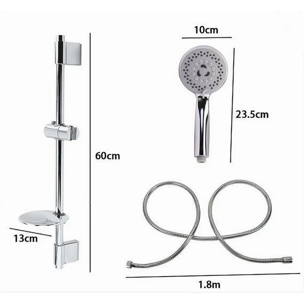 La doccetta ha un diametro di 10 cm e una lunghezza di 23.5 cm, mentre la mensola portasapone misura 13 cm.