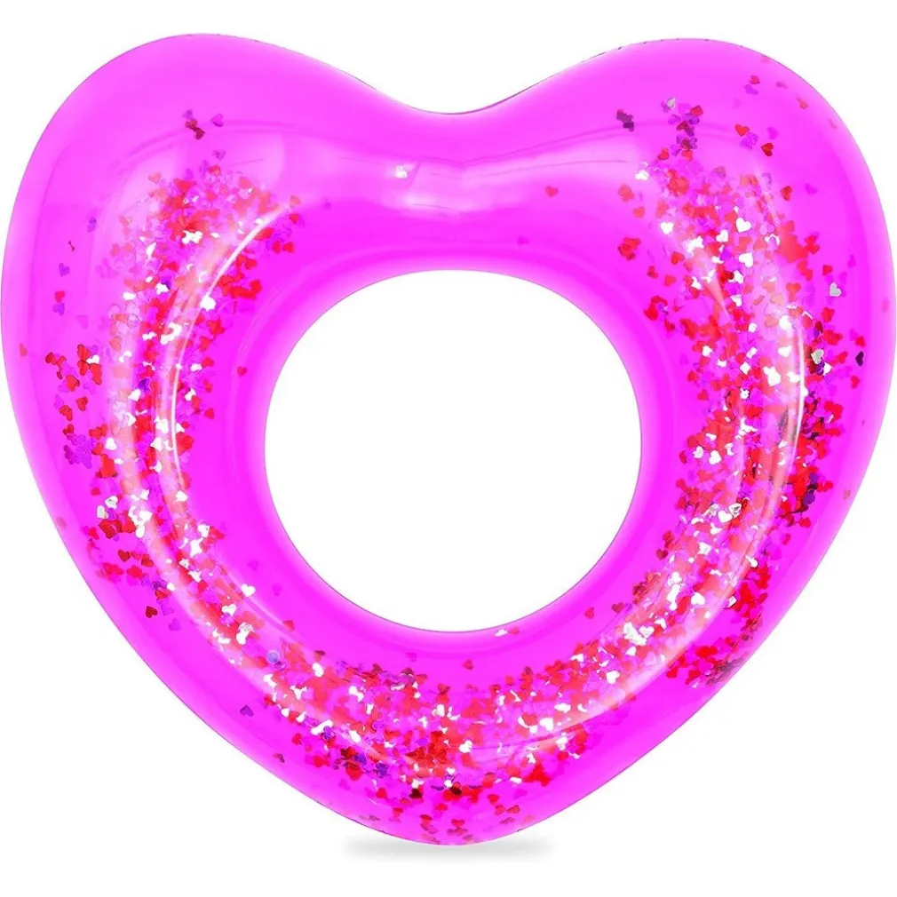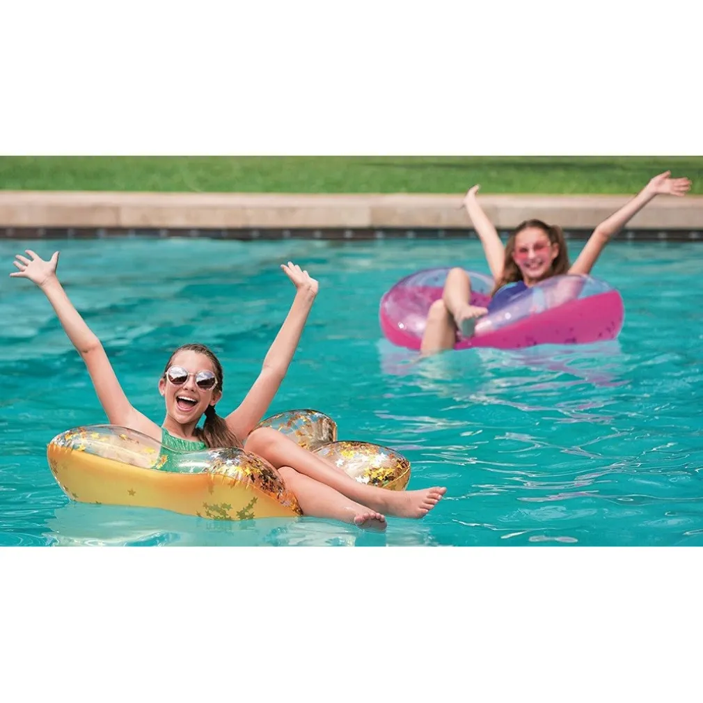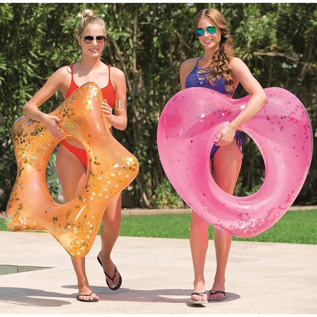Design luccicante per illuminare la vostra estate. Il salvagente Glitter ha design assortiti: una stella gialla e un cuore rosso. Tutti e i design hanno una struttura trasparente che lascia intravedere una pioggia di glitter luccicanti all’interno. Se vuoi rendere la tua estate più splendente, hai bisogno di queste brillanti ciambelle gonfiabili glitterate, pensate per il divertimento di grandi e piccini, sono perfette per gli aperitivi a bordo piscina o in riva al mare.