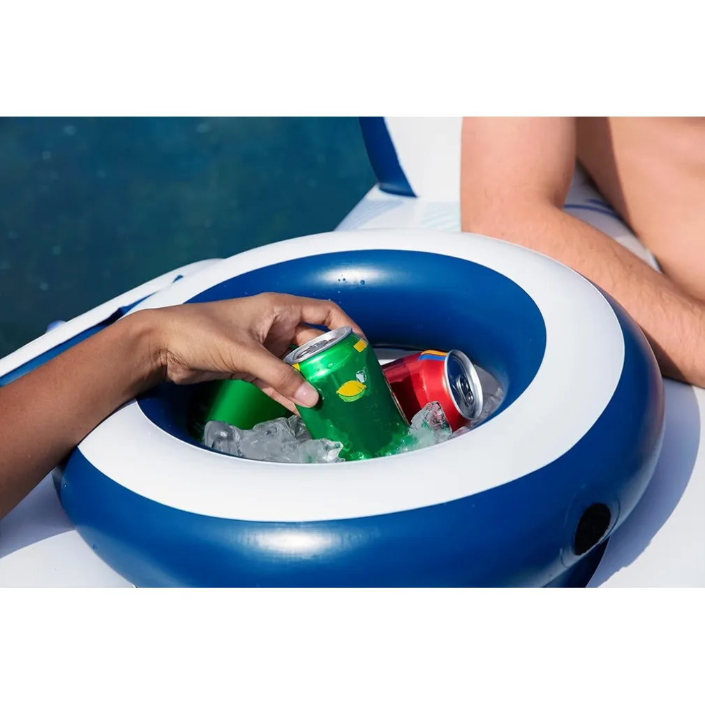 È un gonfiabile galleggiante doppio ideale per rilassarsi in acqua con un amico. Dotato di schienali, fondo in rete, portabicchieri e borsa frigo, è progettato per offrire il massimo comfort durante le giornate calde.