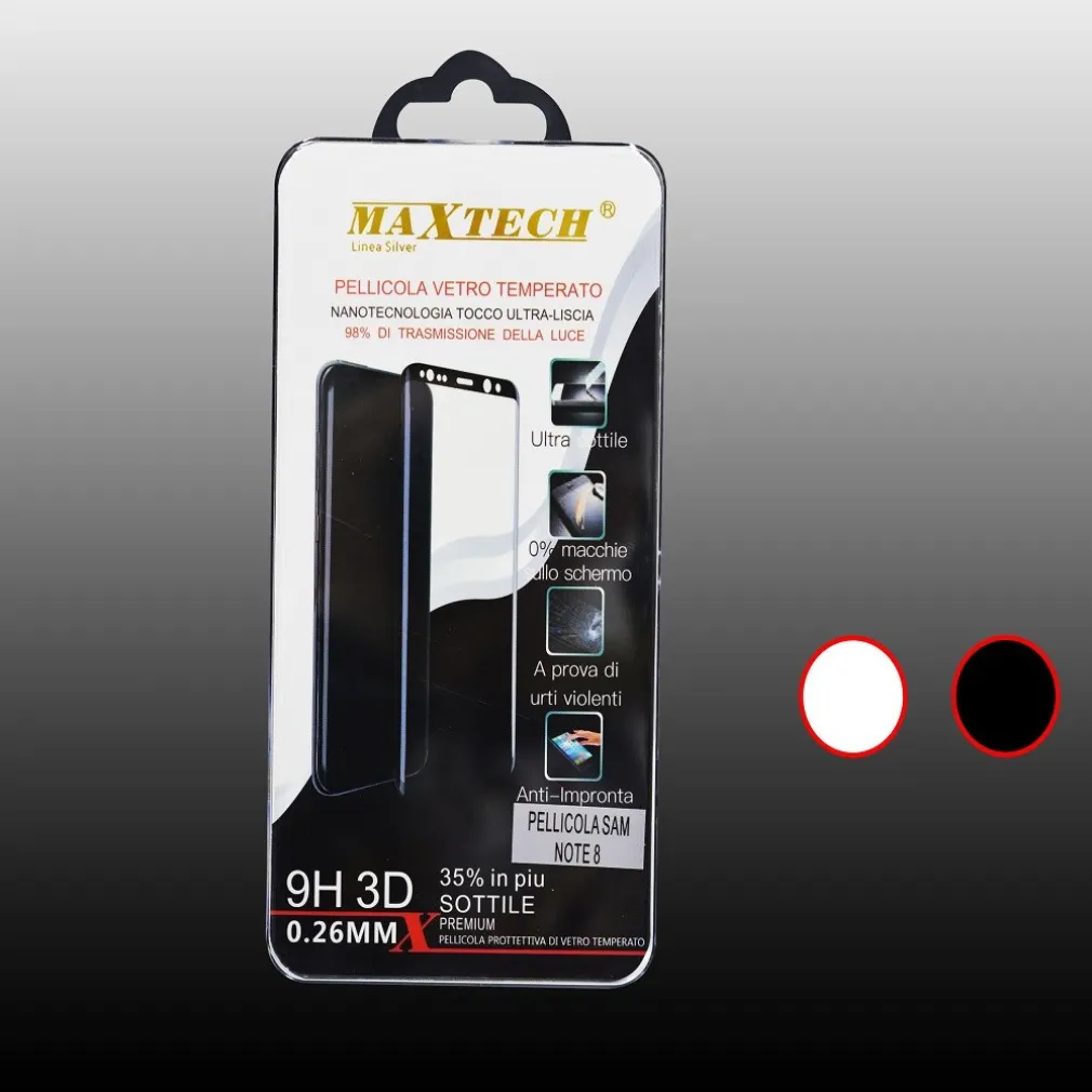 I vetri temperati offrono la massima protezione per il display del vostro Samsung Galaxy Note 8, continuamente minacciato da urti, cadute e usura. Grazie al 3D, questa pellicola copre tutta l’area dello schermo; la cornice segue il design del telefono in modo da conservarne l’aspetto originale. L’area trasparente non altera né la sensibilità del touchscreen né la visibilità delle immagini e offre ottima penetrazione della luce. La sua durezza arriva fino a 9H. Abbiamo inoltre inserito degli strati aggiuntivi per garantire una maggiore flessibilità e durata nel tempo. Il segreto dell’aderenza allo schermo sta nel fatto che solo l’area è completamente adesiva, mentre la parte trasparente è dotata di una sottile trama a puntini. Queste caratteristiche sono fondamentali perché il vetro resti attaccato allo smartphone.