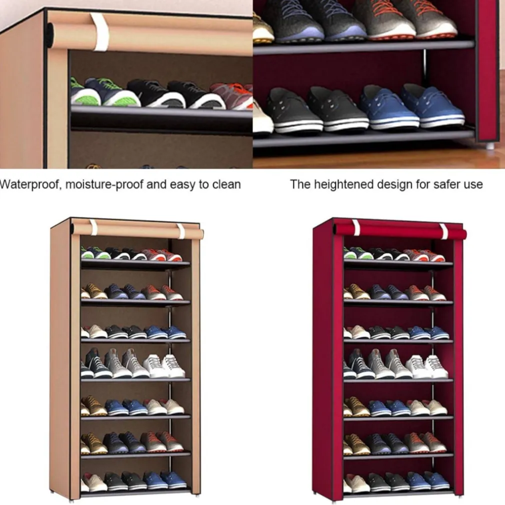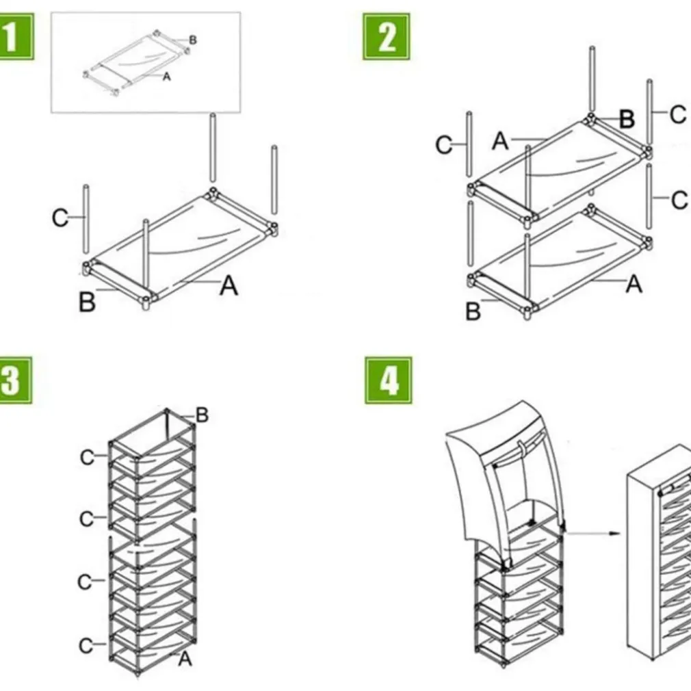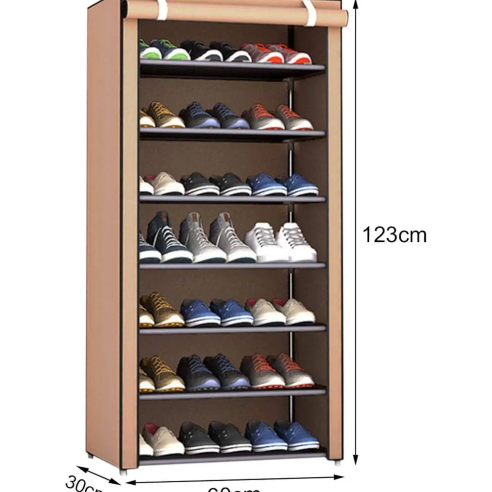 Scarpiera salvaspazio pieghevole su 7 livelli (senza rivestimento 8 ripiani) ideale per casa, campeggio e in vacanza. Pratica e funzionale con montaggio facile per averla a disposizione in qualsiasi momento. Realizzata con struttura in PE e tessuto in TNT impermeabile con apertura frontale arrotolabile. Grazie alla chiusura, le scarpe saranno ben protette dalla polvere. Ha una dimensione di 60x30x122H cm circa e può ospitare un gran numero di scarpe e ciabatte (fino a 21 paia). Inoltre può essere usata anche in vacanza come guardaroba per roulotte e tende. Montaggio facile in 5 minuti grazie alle istruzioni di montaggio incluse e il semplice sistema plug-in, può essere facilmente montato anche da una sola persona.