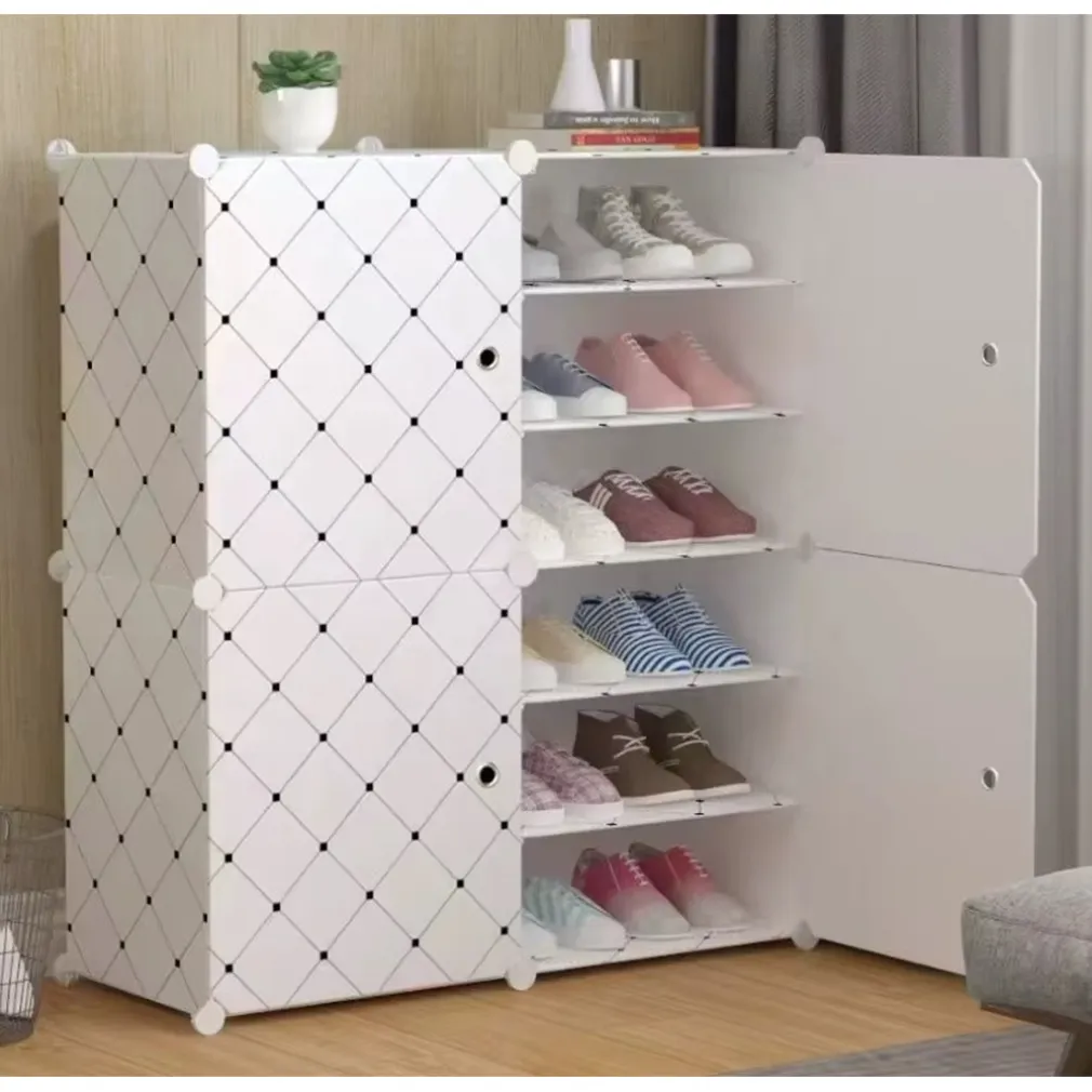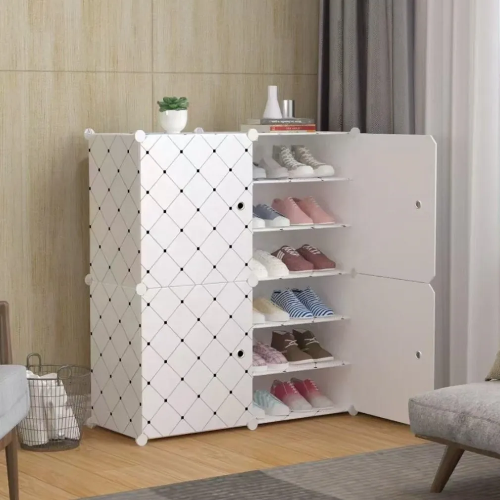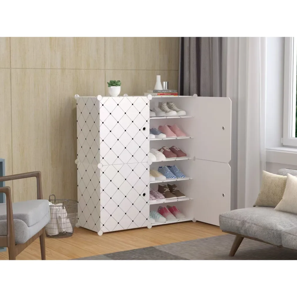 L’oggetto mostrato nell’immagine è una scarpiera modulare dotata di un sistema di montaggio intuitivo che permette di configurare gli scomparti in base allo spazio disponibile. È composta da 4 ante e 12 ripiani, progettati per ospitare fino a 24 paia di scarpe. La struttura in plastica robusta, con pannelli resistenti e connettori in acciaio, offre stabilità e durevolezza, mentre il design salvaspazio la rende ideale per ingressi, camere da letto, bagni, uffici o cabine armadio. Le ante bianche con motivo a rombi neri donano un tocco moderno, proteggendo allo stesso tempo le scarpe da polvere e umidità. L’apertura facilitata dagli occhielli permette una gestione fluida e una ventilazione ottimale.
