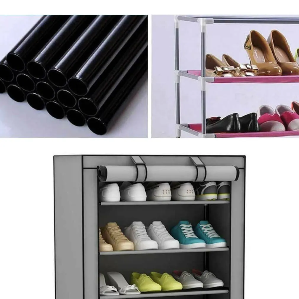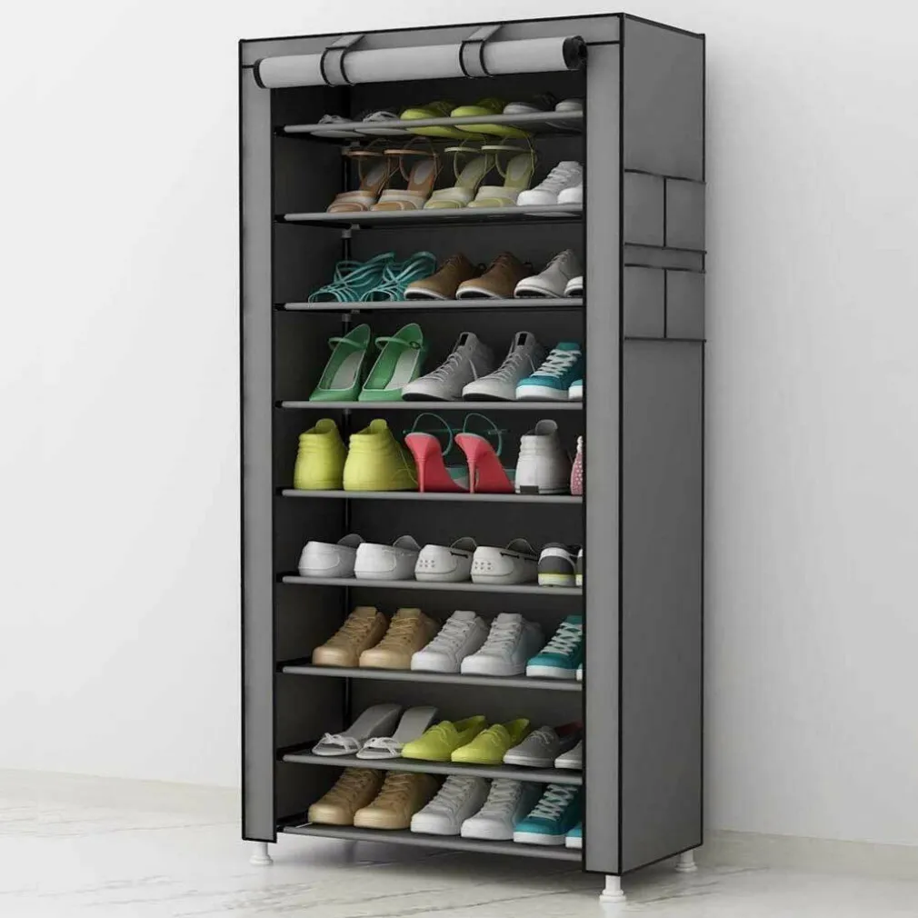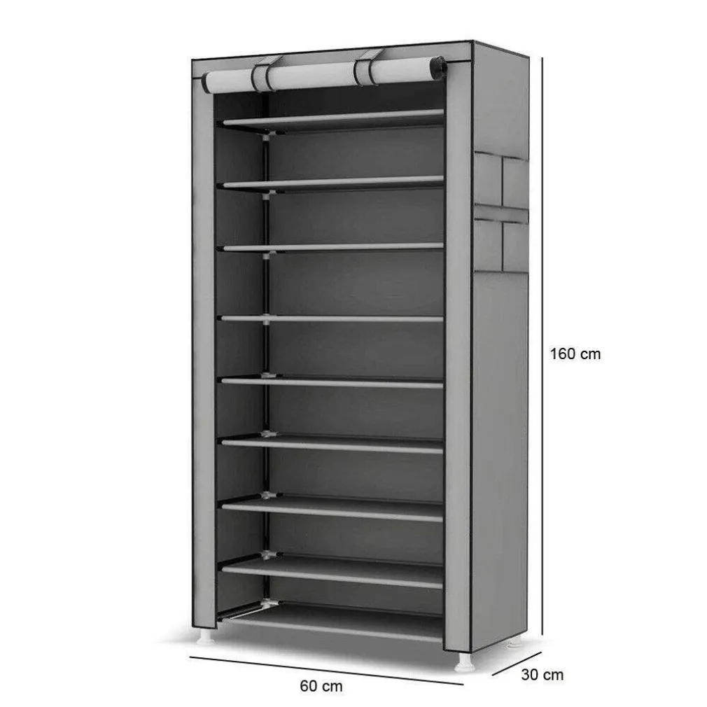 Scarpiera salvaspazio pieghevole su 9 livelli (senza rivestimento 10 ripiani) ideale per casa, campeggio e in vacanza. Pratica e funzionale con montaggio facile per averla a disposizione in qualsiasi momento. Realizzata con struttura in acciaio e tessuto in TNT impermeabile con apertura frontale arrotolabile. Grazie alla cerniera a Zip le scarpe saranno ben protette dalla polvere. Ha una dimensione di 60x30x160H cm circa e può ospitare un gran numero di scarpe e ciabatte (fino a 27 paia). Inoltre può essere usata anche in vacanza come guardaroba per roulotte e tende. Montaggio facile in 5 minuti grazie alle istruzioni di montaggio incluse e il semplice sistema plug-in, può essere facilmente montato anche da una sola persona.