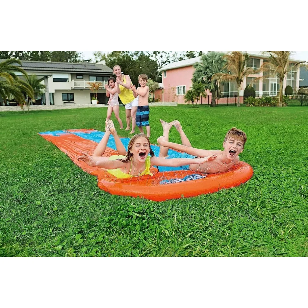 Questo scivolo è stato progettato appositamente per il classico divertimento estivo in giardino. E’ dotato di 2 corsie, consentendo quindi a 2 bambini di sfidarsi e di scivolare in velocità senza intoppi fino al traguardo nella piscinetta finale in un trionfo di spruzzi. Gli spruzzatori integrati producono infatti un effetto cascata per regalare e mantenere le corsie sempre bagnate. I bambini non potranno che amare questo scivolo ed i genitori sapranno apprezzare quanto sia semplice da installare, basta infatti collegarlo un tubo da giardino e il divertimento ha inizio.