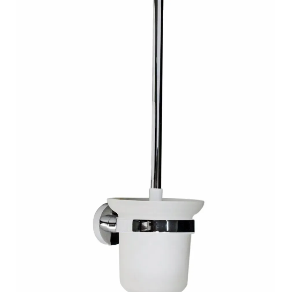 Scopino da bagno e portascopino con bicchiere in vetro da installare a parete o con le viti incluse nella confezione oppure con un mastice (colla) dalla presa ultraresistente anch’essa inclusa nella confezione.