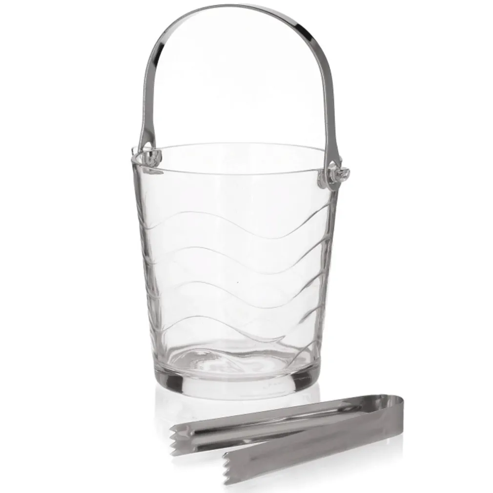 Elegante e raffinato secchiello in vetro portaghiaccio, effetto onde, ideale per le tavole di buffet e ristoranti, con inclusa una pinza prendi ghiaccio e manico pieghevole da applicare manualmente.