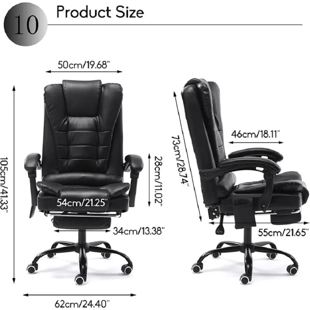 La poltrona da massaggio è realizzata in pelle PU di alta qualità, piena di spugna, morbida e confortevole. Lo schienale ultra morbido con schienale alto fornisce il miglior supporto lombare. La funzione di inclinazione può essere regolata da 90 gradi a 135 gradi. La sedia da ufficio ha 5 robuste basi in nylon per impieghi gravosi, struttura in metallo, robusta e durevole, forte capacità portante, antiruggine, lunga durata e portata massima di 150 kg. La sedia da ufficio multifunzione regolabile per massaggi deve essere autoassemblata e può essere ruotata di 360° in base alle esigenze delle persone e può essere regolata quando si è sdraiati. La poltrona da massaggio è progettata ergonomicamente. Non è stanco dopo essere stato seduto per molto tempo. Il morbido poggiatesta si adatta al tuo collo e abbatte la pressione in tutte le direzioni per aiutarti a rilassarti. L’altezza della poltrona da massaggio è di 110-118 cm, il cuscino è di 55 * 54 cm e lo schienale è di 50 * 70 cm.