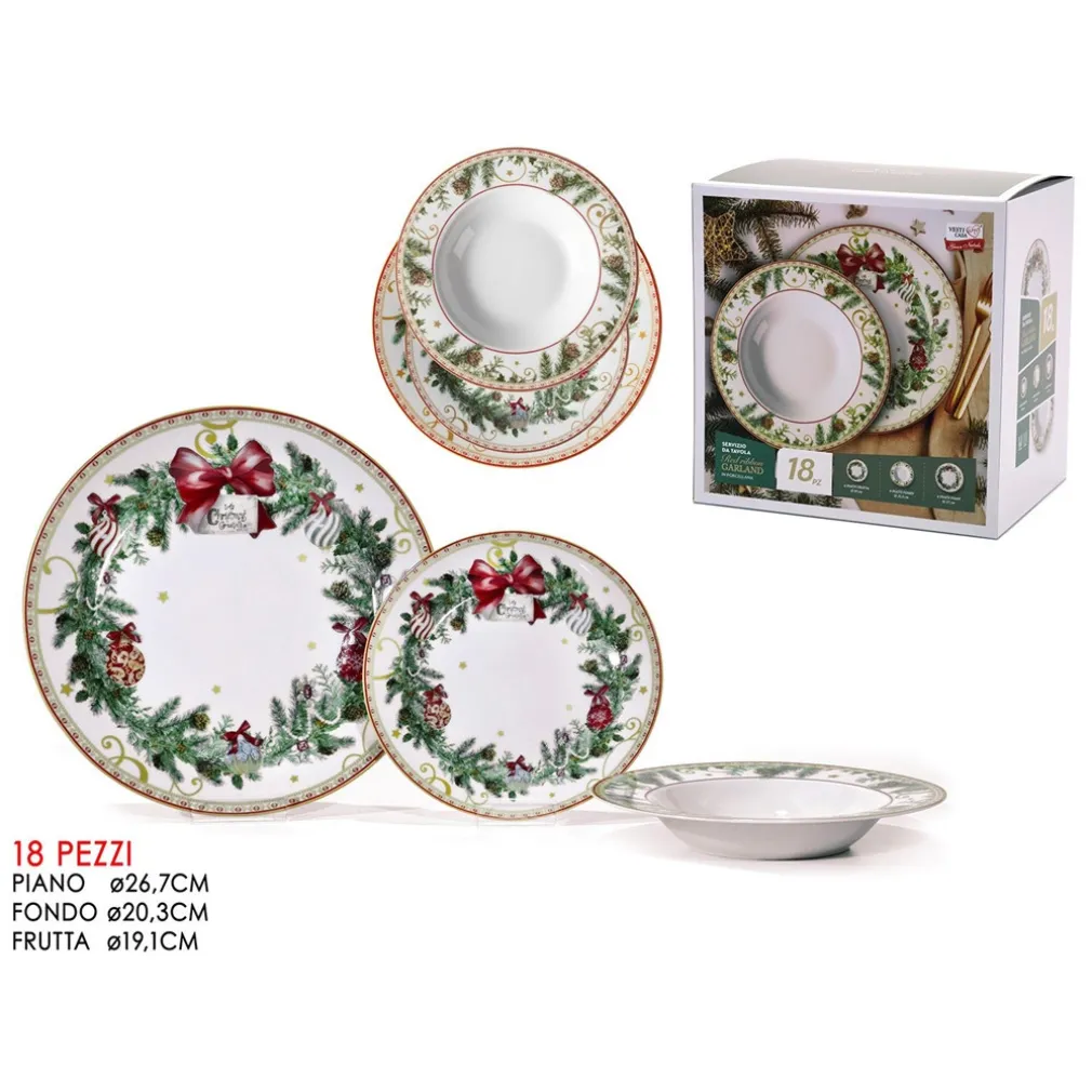 SERVIZIO DI PIATTI IN PORCELLANA 18PZ DECORO NATALIZIO GHIRLANDE AGRIFOGLIO FIOCCHI ROSSI