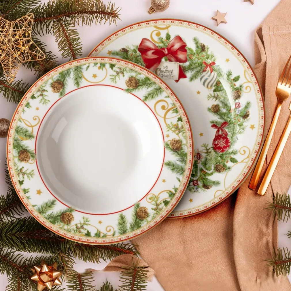 La combinazione tra porcellana di qualità, decoro natalizio elegante e versatilità d’uso. È perfetto per chi vuole arricchire la propria tavola con stile e armonia durante le festività.