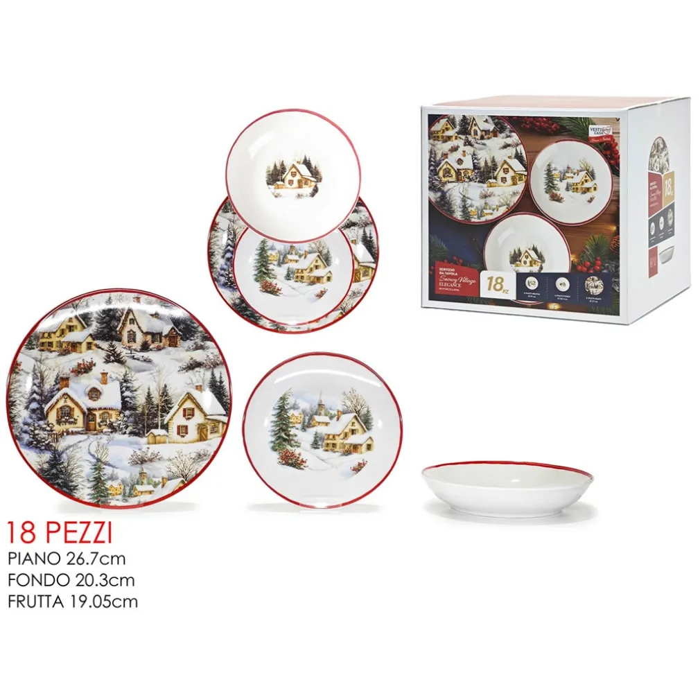 Il Servizio piatti tavola natalizio in porcellana 18pz include piatti piani, piatti fondi e piatti da frutta, sufficienti per servire comodamente 6 persone.