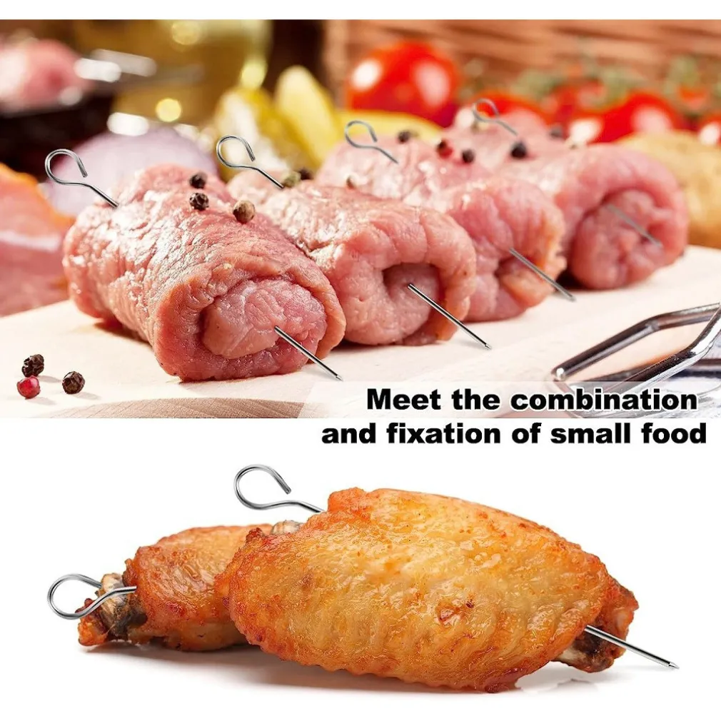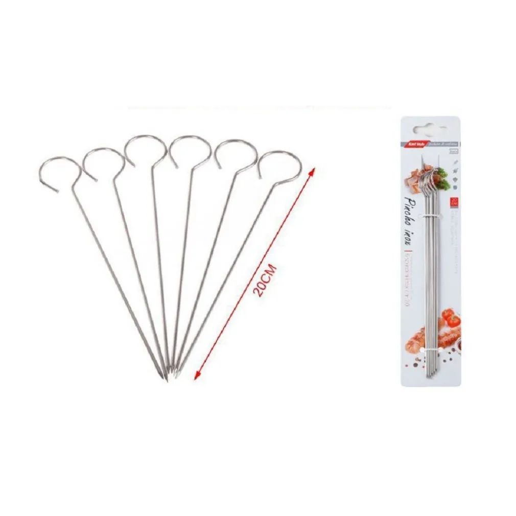 Spiedini in acciaio inox con impugnatura ad uncino. Ideali per cuocere alla griglia carne, verdure e pesce, realizzato in acciaio inossidabile di alta qualità, robusto e resistente. Estremamente appuntito per permettere un una facile infilzatura del cibo, corpo liscissimo e senza bave. Tenere lontano dalla portata dei bambini. Pulire e asciugare bene dopo l’utilizzo, non toccare la parte metallica durante la grigliatura.