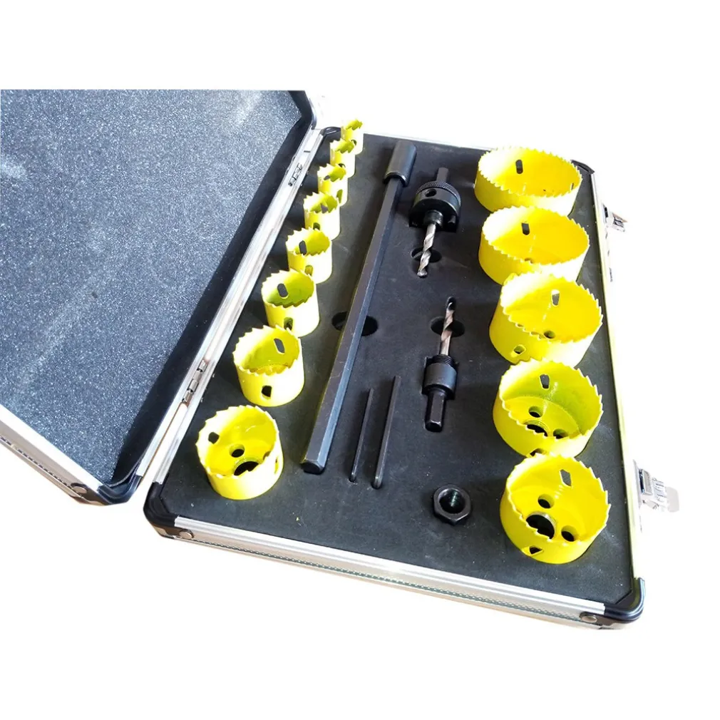 Nuovissimo set di frese a tazza con tutti gli accessori per il loro utilizzo. Ideali sia per falegnami ma anche come set da avere a portata di mano nel vostro garage per i vostri piccoli lavoretti e il fai da te. Il set contiene 13 frese a tazza composte in acciaio rigido HSS risultano ideali per la foratura in legno, plastica, metallo, cartongesso, vetroresina, pvc, compensato. Set frese a tazza nel formato da 19 mm (3/4 “) a 76mm (3”) di diametro. Inclusi due supporti per le frese da trapano, bullone, due chiavini e una prolunga da 30cm.Tutto il kit è fornito ordinatamente in una custodia. Ideali per eseguire i fori per il passaggio dei tubi, l’installazione di tubi di areazione, per interruttori e cassette di derivazione ad incasso.
