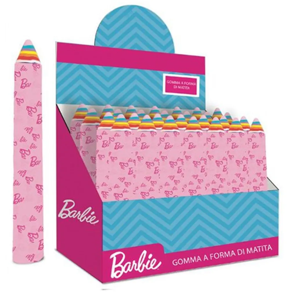 - Design originale e divertente: la gomma richiama la forma di una matita gigante, con colori vivaci e dettagli ispirati al tema Barbie, perfetta per attirare l’attenzione dei più piccoli.