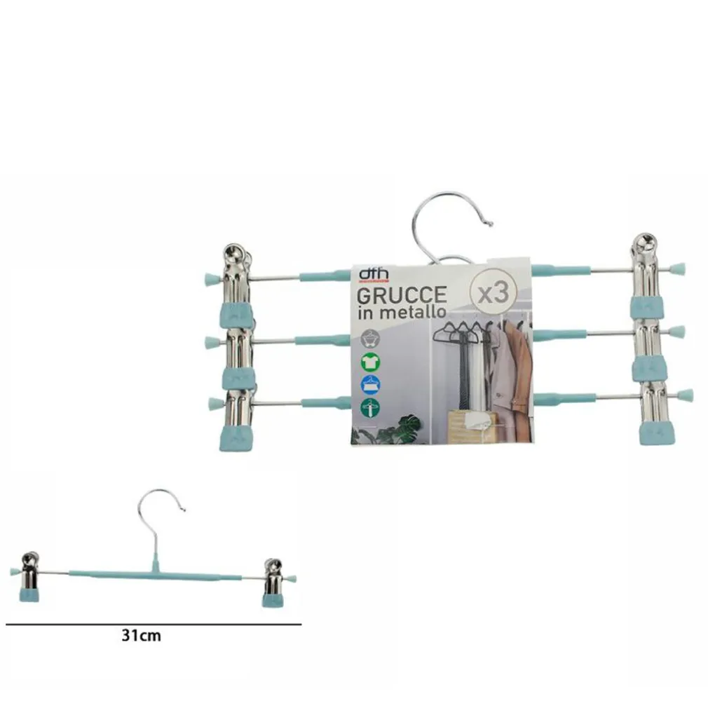 Set 3 grucce per pantaloni fashion in metallo azzurre. Le grucce nere hanno due clip antiscivolo e renderanno il tuo armadio più ordinato ed allegro. Comode e soprattutto salvaspazio, sono ideali per pantaloni, gonne, shorts, e altri accessori!