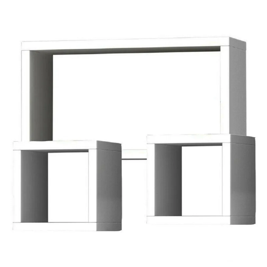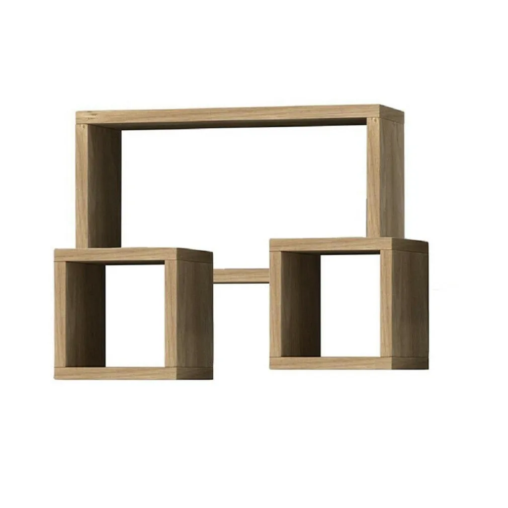 Set di 3 mensole a muro composte da una mensola rettangolare e due quadrate. Realizzate in legno mdf. Ideale per realizzare composizioni a piacere fornendo lo spazio necessario per organizzare libri, cd e altri oggetti. L’installazione è semplice e veloce con tasselli inclusi nella confezione.