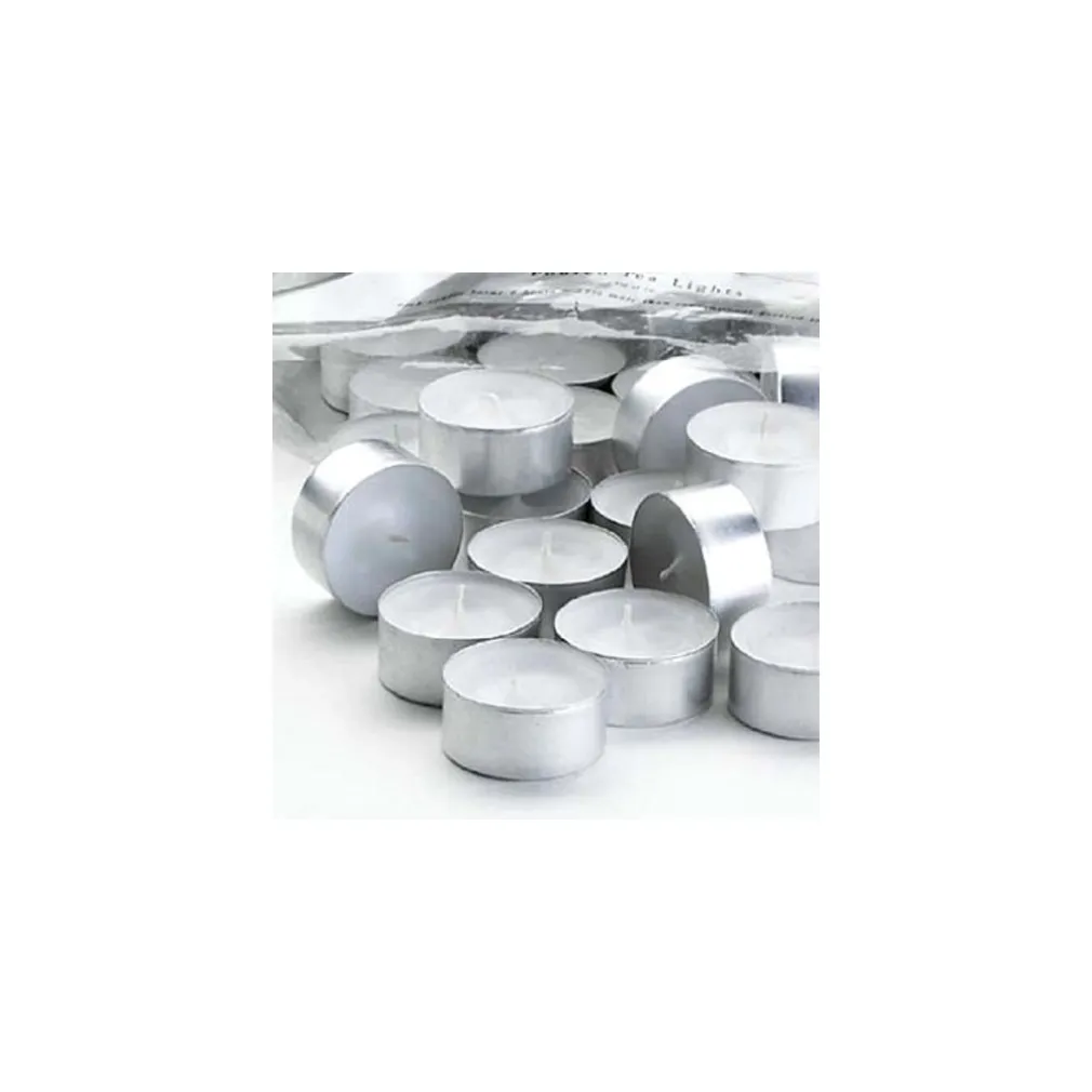 Confezione da 50 pezzi di Candele tea light bianche tonde. Ideali per dare un tocco di eleganza e creare atmosfera in occasione di cene, feste e eventi in genere.