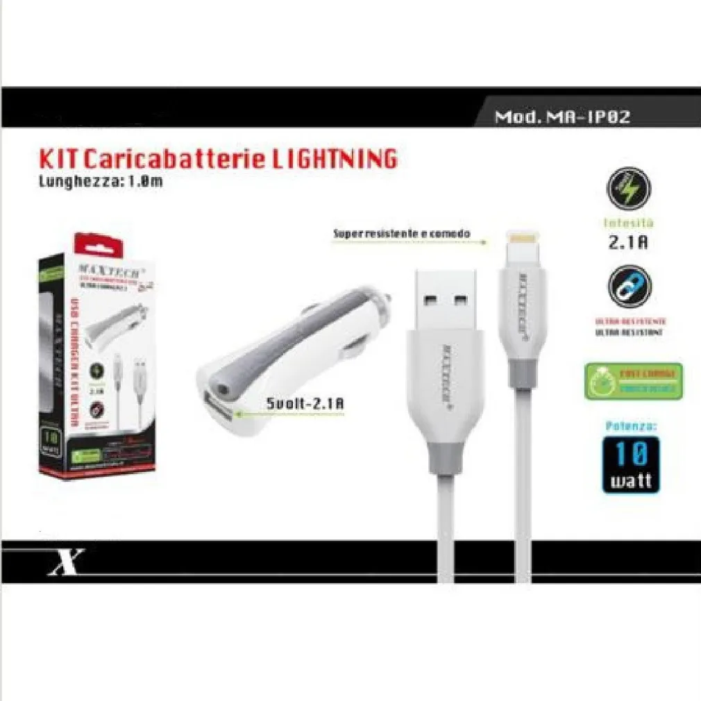 Cosa è il set caricatore MA-IP02? Il set caricatore MA-IP02 è un pratico kit che include un caricatore USB per accendisigari da 2,1 A e un cavo USB/Lightning da 1 metro, progettato per ricaricare i dispositivi Lightning in auto.