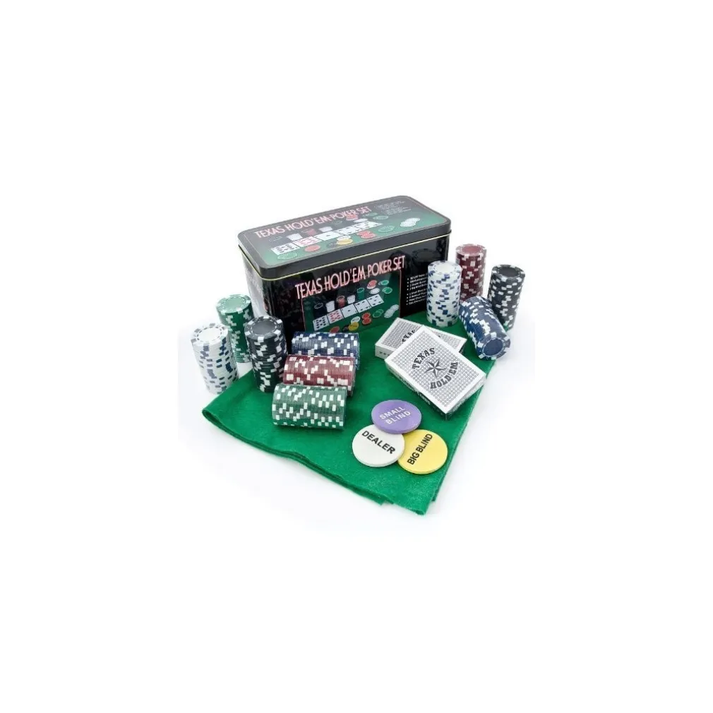 Il set da poker in una scatola in metallo è adatto benissimo per texas holdem poker e blackjack. il set è composto da un campo da gioco (in feltro), 200 fiches di 2 colori, 2 mazzi di carte da gioco, 1 dealer button, 1 small blind button, 1 big blind buttone e un sopporto per fiches.