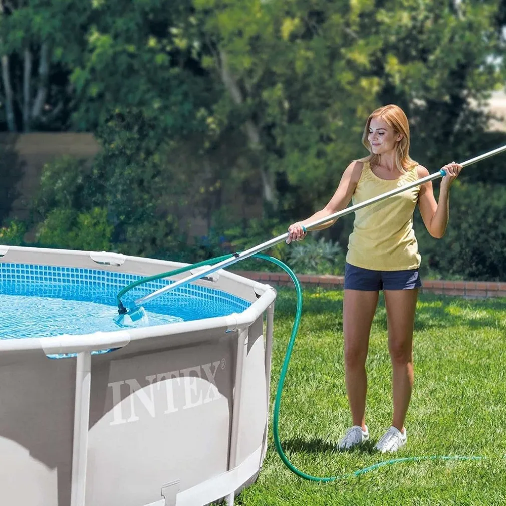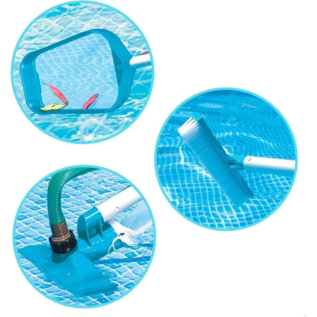 Ideale per la pulizia della tua piscina fuori terra, il set è formato da un retino per poter eliminare lo sporco presente in superficie, un aspirapolvere utile per la pulizia del fondo e una spazzola per pulire il fondo e le pareti. Il kit è compatibile con il manico telescopico da 239 cm.