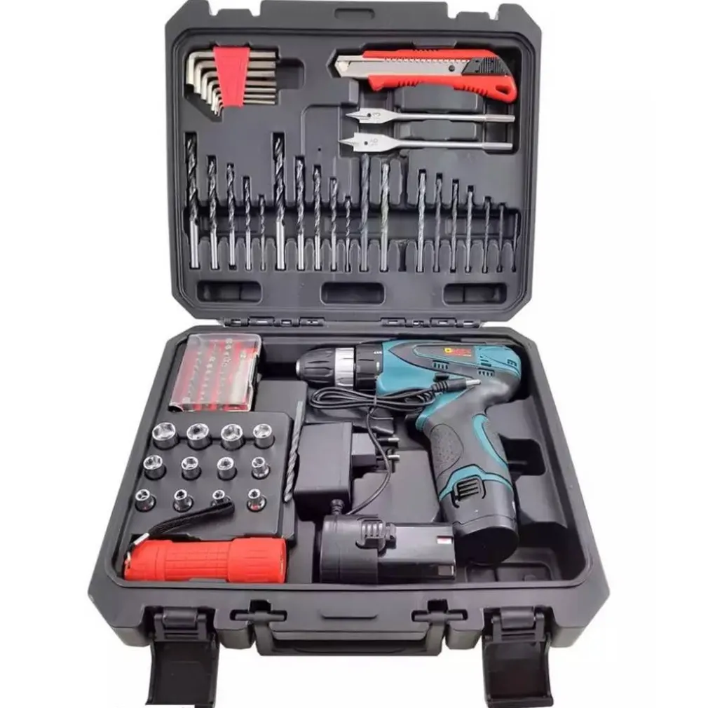 Che tipo di attrezzatura è inclusa nel set? Il set comprende una vasta gamma di accessori, tra cui bit, trapani, punte, un coltello, una torcia elettrica, e molto altro, offrendo una soluzione completa per tutte le vostre esigenze di foratura e avvitamento.