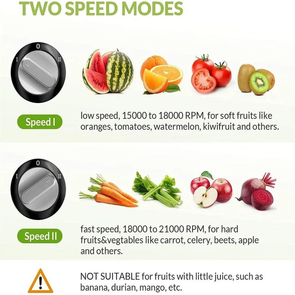 - Velocità Di Succo Professionali”P” per massima velocità , “I” per bassa velocità, “II” per velocità elevata. Il controllo con 3 velocità massimizza la resa di succo di verdure morbide a foglia verde e frutti duri, si può usare la bassa velocità per frutta e verdura più tenera o la velocità più alta per quelle più dure.