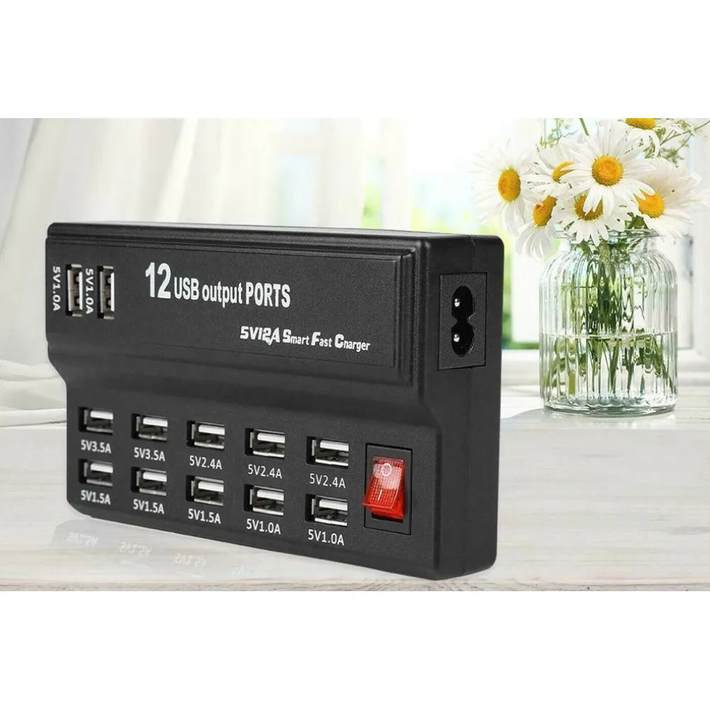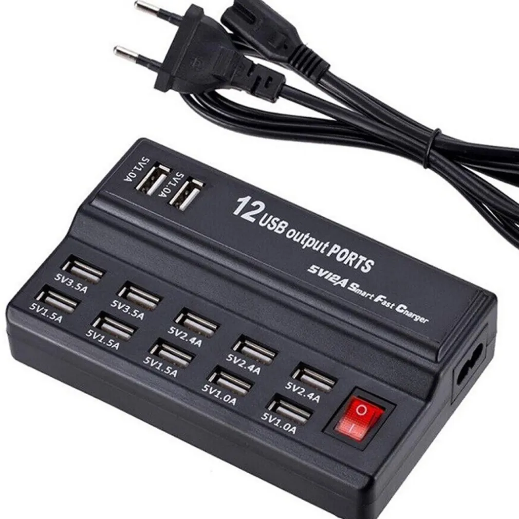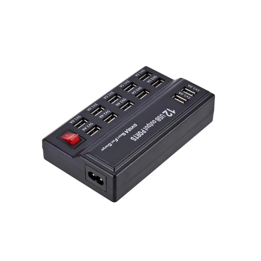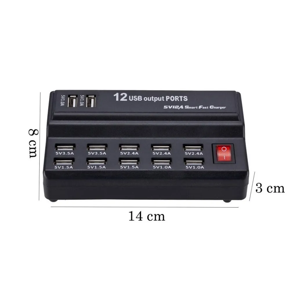 Stazione dotata di 12 porte USB capace di ricaricare più dispositivi contemporaneamente! Caricatore da presa con 12 porte USB per i tuoi dispositivi. Dispone di un interruttore di sicurezza On/Off e di protezione da surriscaldamento e sovraccarico. Adatto per caricare telefoni cellulari, fotocamere e altri dispositivi che si ricaricano tramite USB.