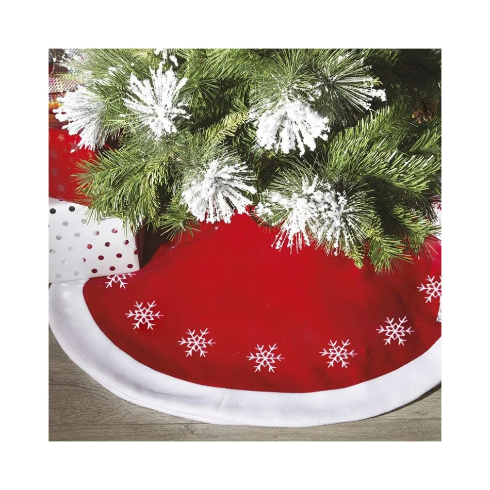 Realizzato interamente in tessuto rosso con bordo in colore bianco, decorato con dei bellissimi fiocchi di neve. Il diametro di ben 105 cm permette la compatibilità con la maggioranza degli alberi di Natale.