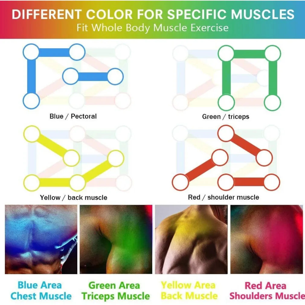 - Allenamento completo: Grazie ai colori codificati, ogni area (petto, spalle, schiena, tricipiti) viene stimolata in modo specifico.