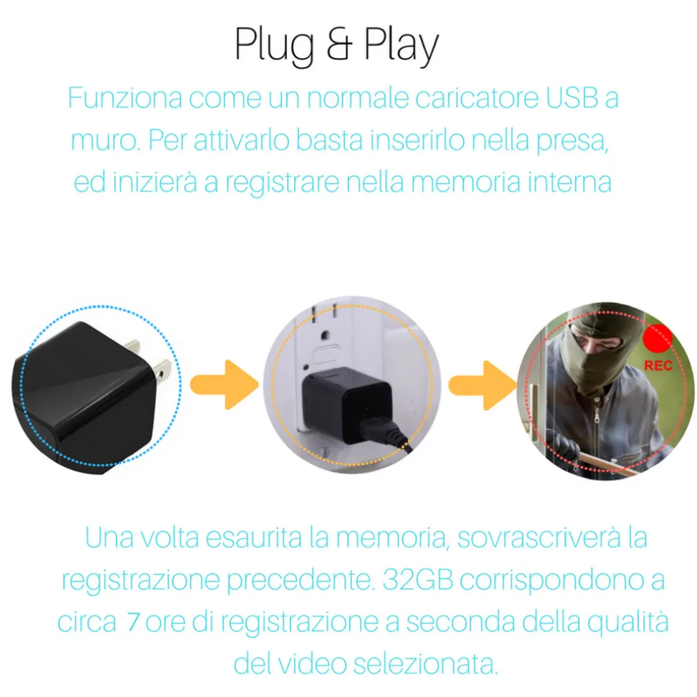 - 2 – inserire la spy cam nella presa della corrente – in questo momento la registrazione inizia senza fermarsi fino al totale raggiungimento della memoria.
