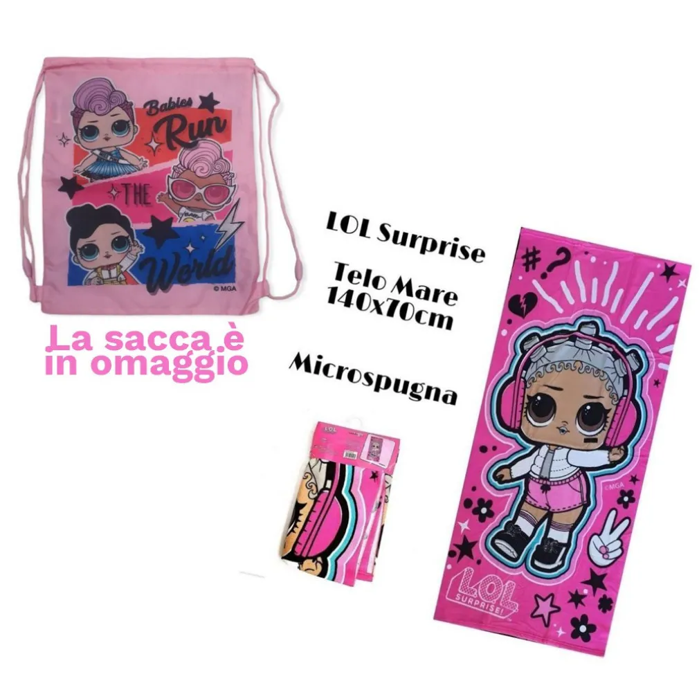 Telo mare LOL Surprise: colorato, divertente e con sacca omaggio! Goditi il mare con le tue LOL preferite e ricevi una sacca pratica in omaggio. Morbido e assorbente, perfetto per le giornate al mare o in piscina. Aggiungi un tocco di sorpresa al tuo stile estivo!
