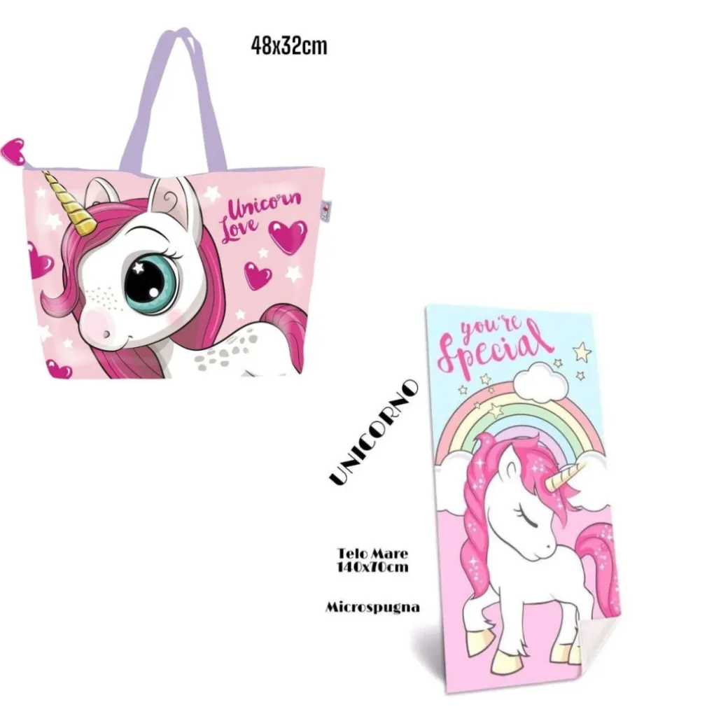 Telo mare unicorni rosa: magico e con sacca omaggio! Morbido, colorato e assorbente, perfetto per le giornate al mare. Aggiungi stile e praticità con la borsa mare assortita. Goditi il mare con i tuoi unicorni preferiti!