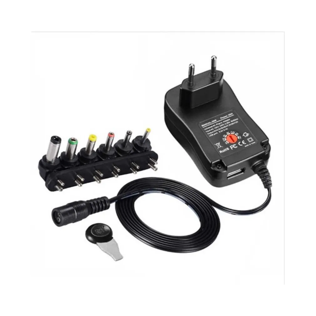 Alimentatore universale 12V con 6 adattatori universali per ricaricare ed alimentare diversi dispositivi elettronici inclusi nella confezione. Grazie al selettore possiamo selezionare il voltaggio desiderato da 3 Volt fino a 12V. Dotato di led che indica il funzionamento è ideale per avere in un’unica soluzione un alimentatore universale. La potenza è di 45W con 500 mA.