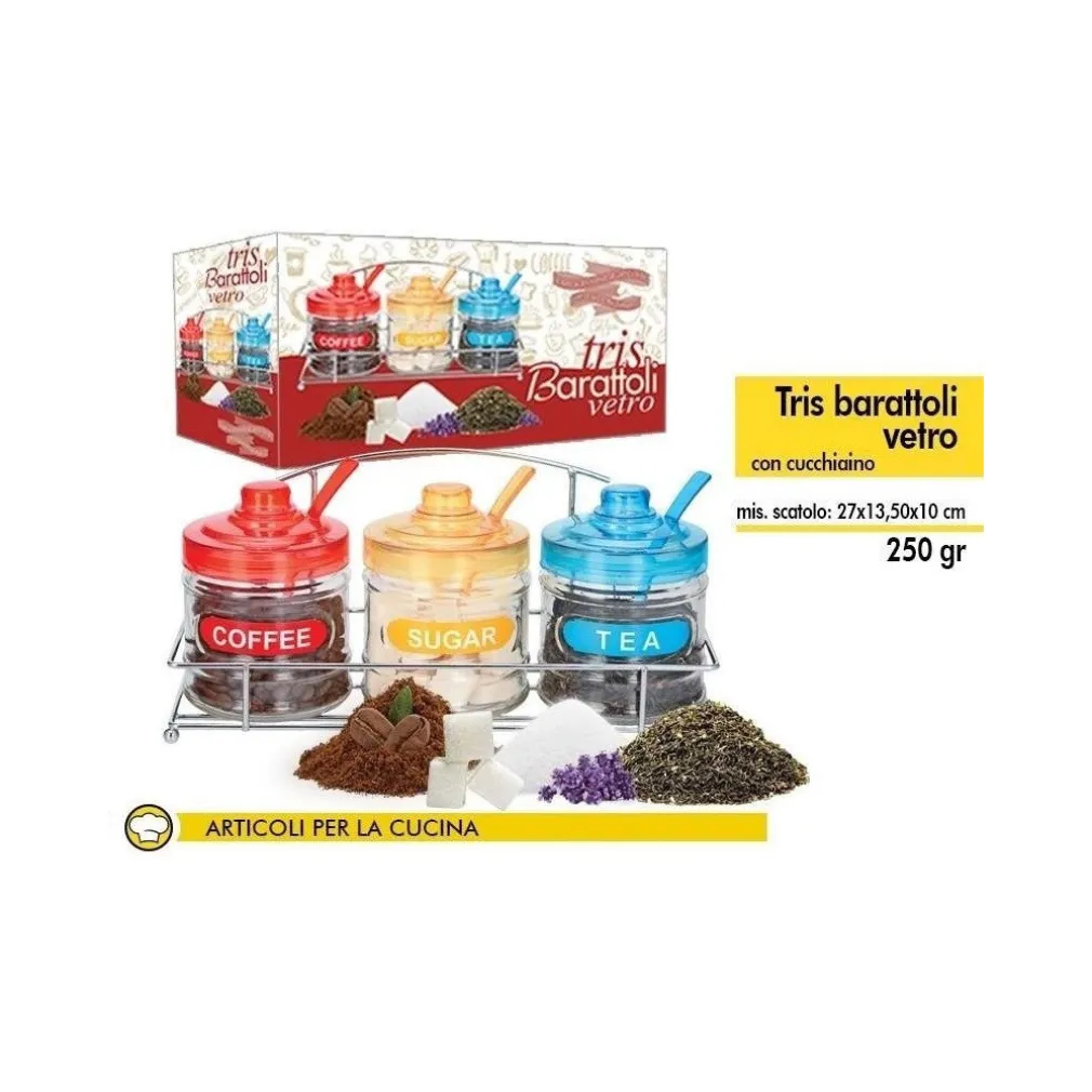 Tris Barattoli Contenitori Caffè Zucchero Tè in Vetro con Tappo Colorato