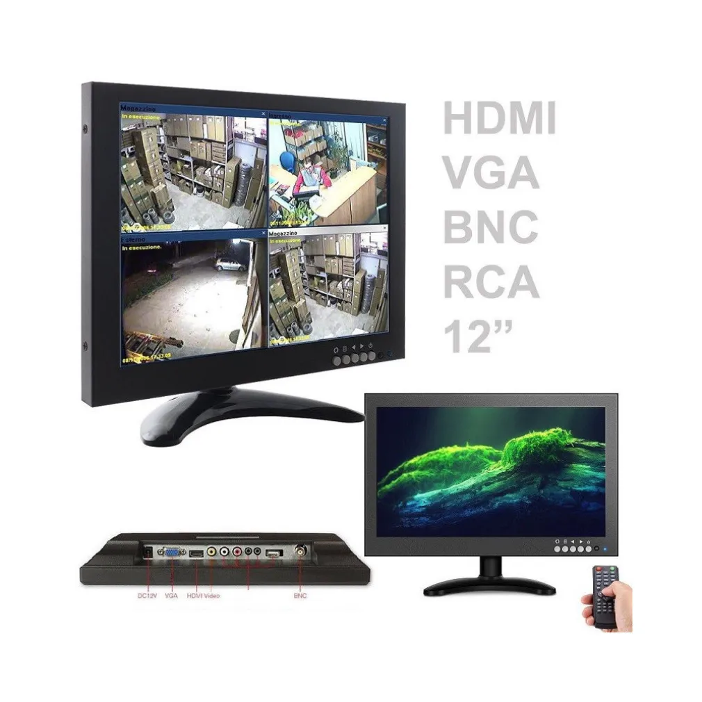 MONITOR LCD 12” COLORI CCTV HDMI RCA VGA LED AV TELECOMANDO BNC TELECAMERA PC
