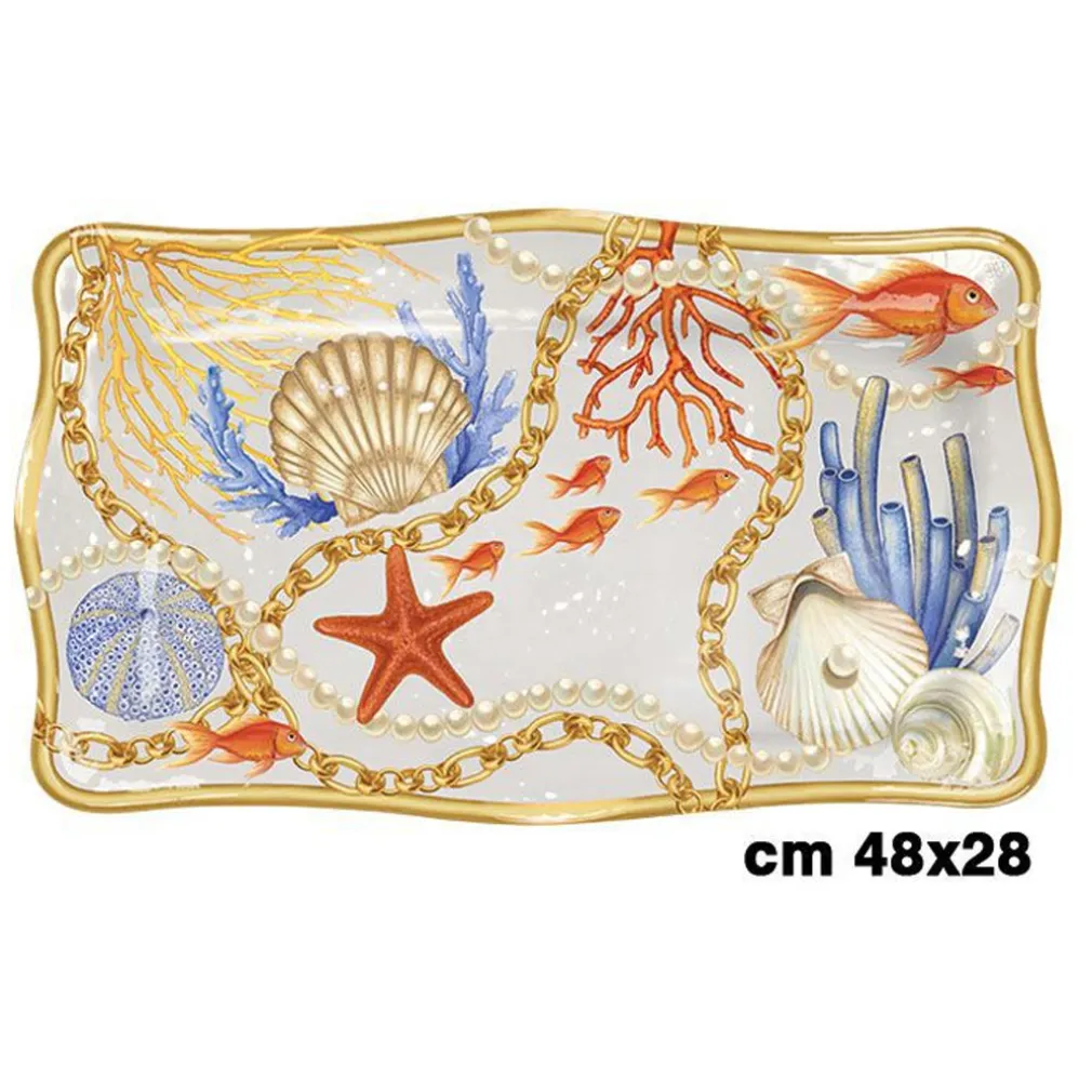 Nuovissimo vassoio centrotavola, super colorato! Porta in tavola l’allegria con il nuovo in stile marino, con conchiglie e coralli! Ideale da usare come antipastiera, per portare in tavola frutta, formaggi, come centrotavola da arredo, per sfiziosi aperitivi, svuota tasche e come idea regalo!