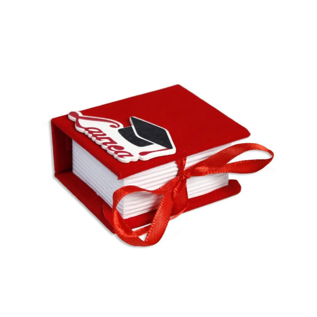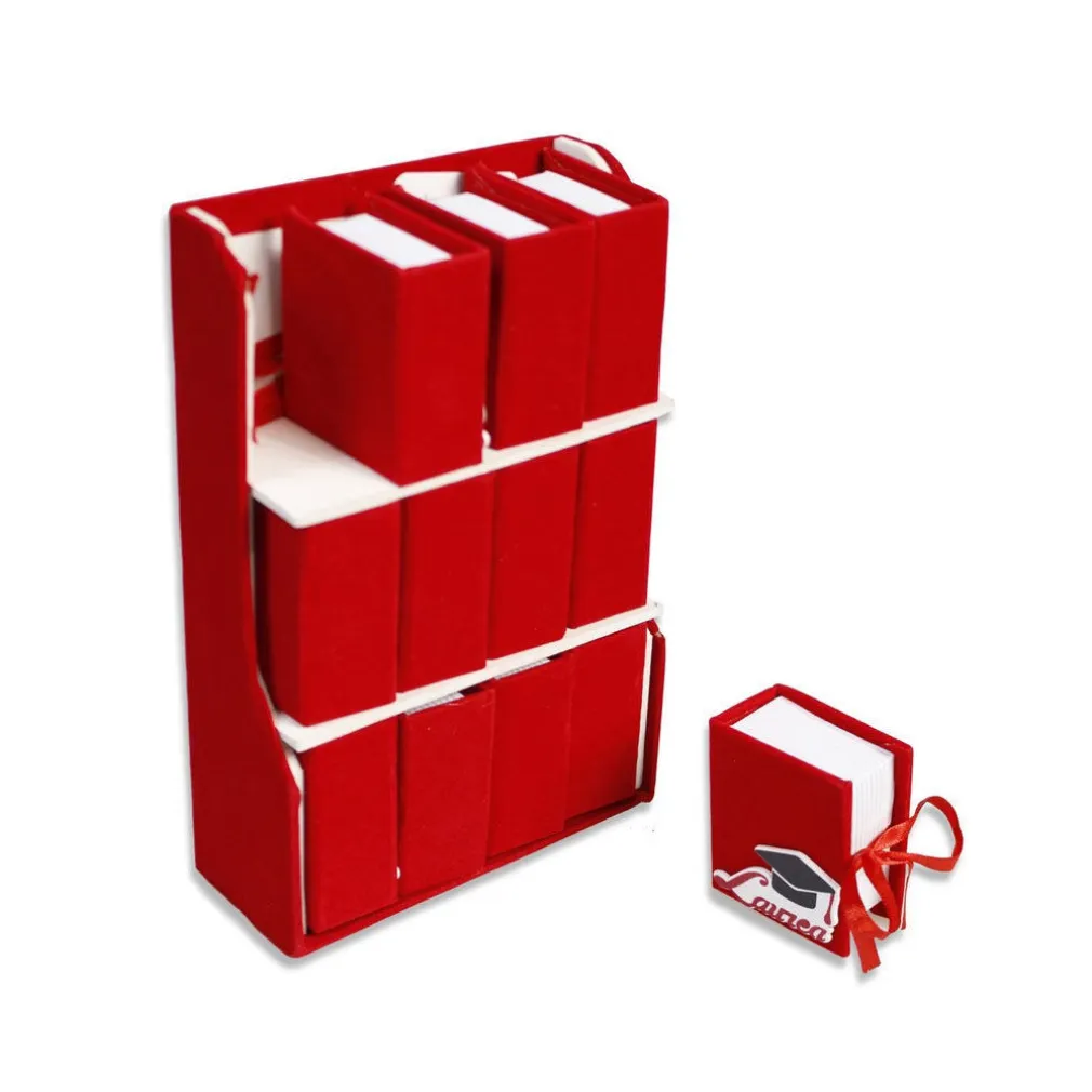 Raffinate e originali bomboniere a forma di libro per la laurea realizzate in cartone rivestito di velluto decorate con tocco, dove poter inserire confetti o caramelle. Stupite i vostri amici e parenti con queste fantastiche ed originali bomboniere che possono essere riutilizzare come porta oggetti!