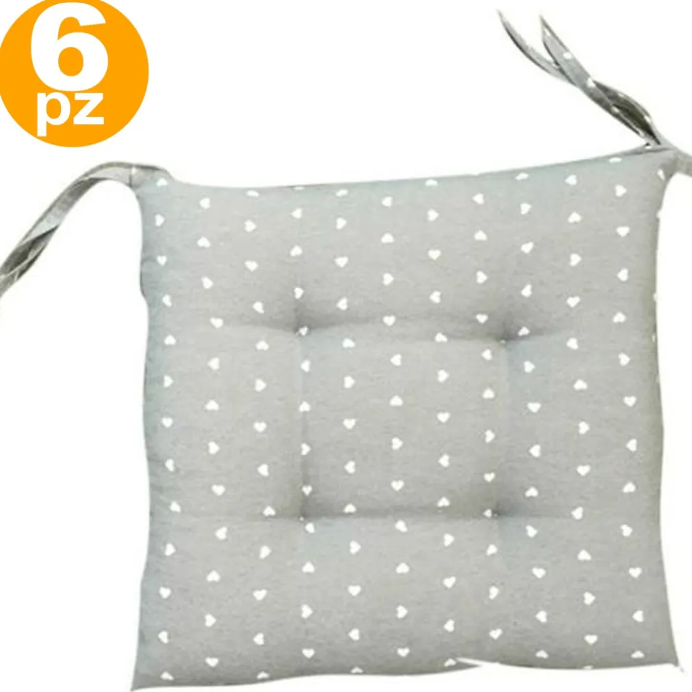 Contenuto della Confezione: Il set include 6 Coprisedia Cuscini Grigio Cuori Margot, ognuno dotato di 2 laccetti per una facile applicazione. Porta stile e comfort nella tua casa con questi eleganti accessori per sedie.