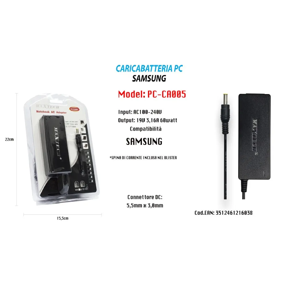 - Compatibilità: Progettato appositamente per i notebook Samsung, il caricabatteria PCCA005 garantisce una perfetta integrazione con i tuoi dispositivi, assicurando una ricarica sicura e compatibile.