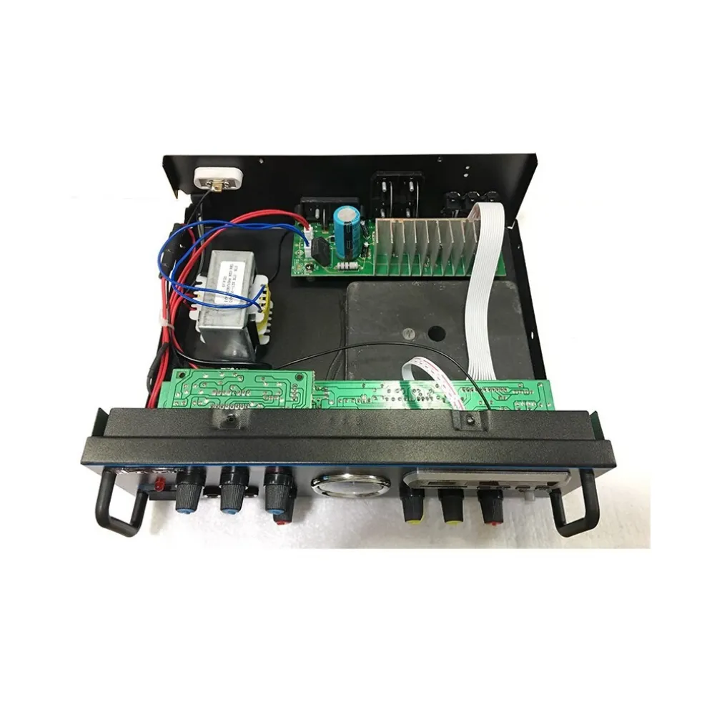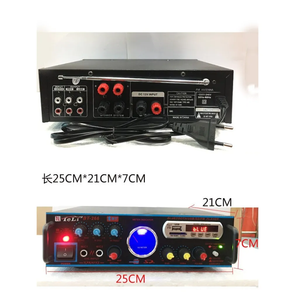 Con funzione Bluetooth e distanza di trasmissione per la connessione del telefono fino a 10 m. Puoi collegare fino a 2 microfoni. Premere il pulsante “Μode” per cambiare le funzioni tra Bluetooth, FM e Karaoke. Supporta scheda di memoria SD e chiavetta USB. Contiene telecomando e manuale. L’amplificatore del suono è l’elemento principale del sistema audio. Il compito principale dell’amplificatore è di ricevere un segnale dall’unità principale e di amplificare la sua tensione e corrente al livello necessario per il normale funzionamento degli altoparlanti. Il nostro amplificatore audio comodo e pratico per ascoltare al meglio la tua musica preferita!