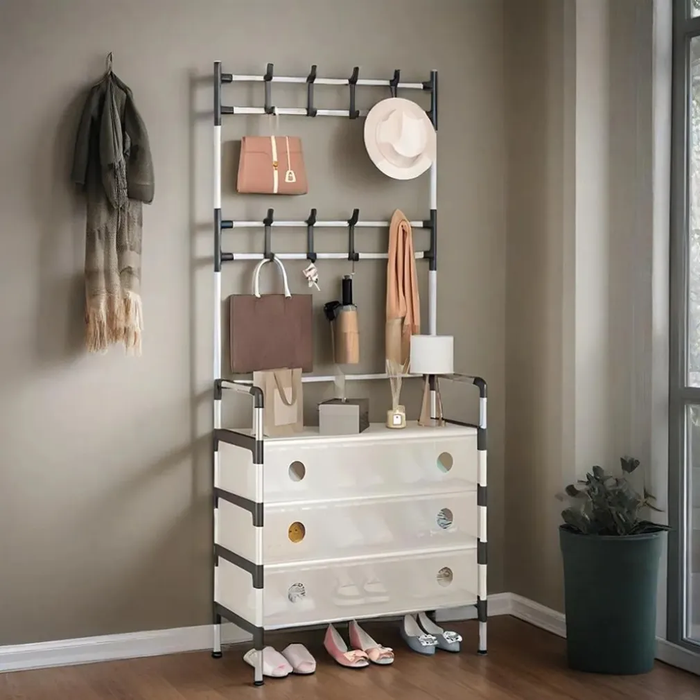 Se cerchi una soluzione pratica, elegante e capiente per organizzare al meglio il tuo spazio, il nostro APPENDIABITI 8 GANCI SCARPIERA 4 RIPIANI ORGANIZER SCARPE ARMADIO MULTIFUNZIONE IN ACCIAIO è la scelta perfetta. Con il suo design moderno e funzionale, ti permette di riporre in ordine vestiti, borse e scarpe, rendendo la tua casa o il tuo ufficio sempre ordinati e accoglienti.
