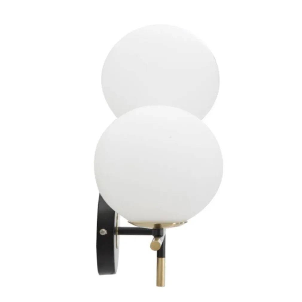 Realizzata in metallo robusto con finitura opaca, questa applique presenta una struttura geometrica raffinata che sostiene due sfere bianche in polietilene.