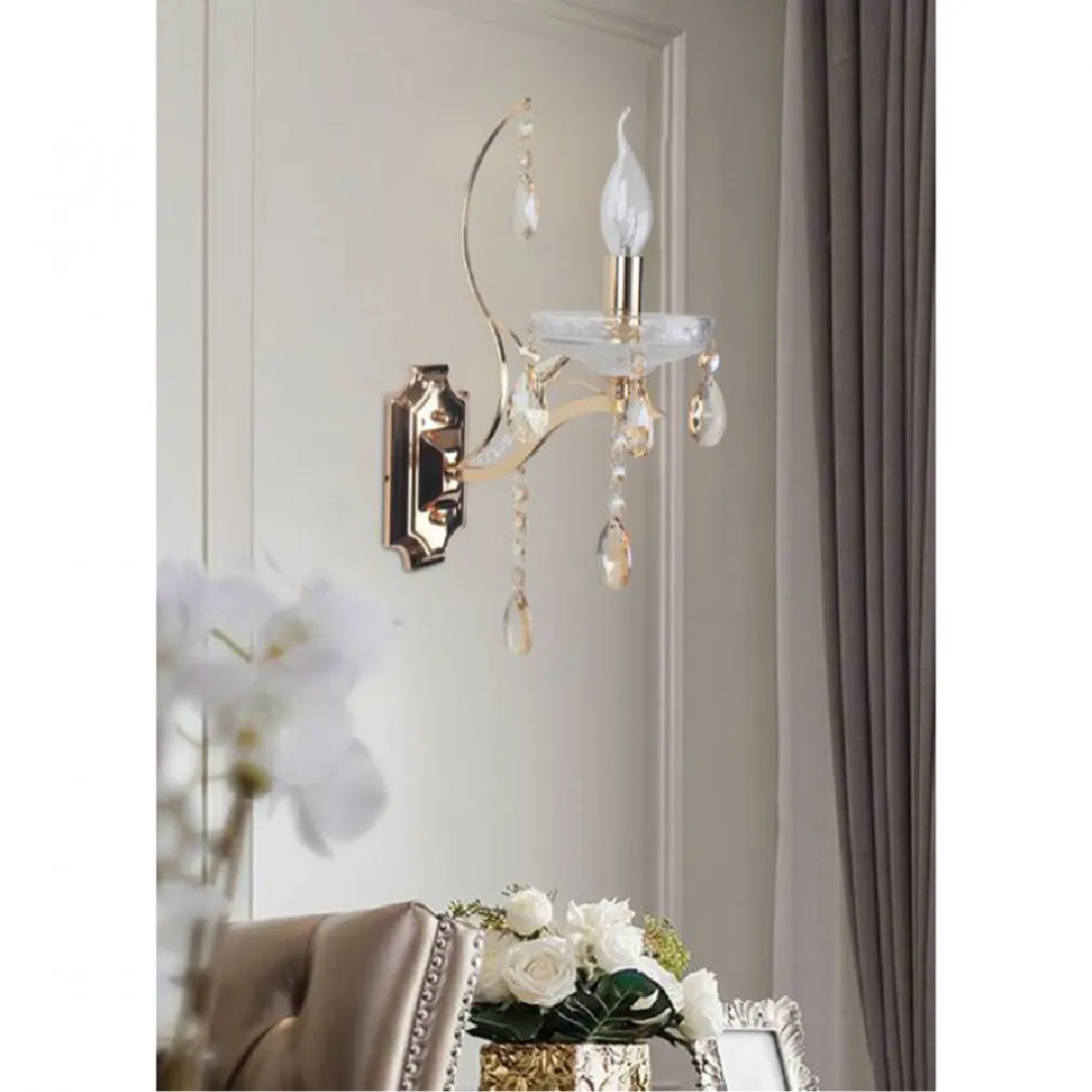 Applique classica dotata di 1 braccio. La struttura del corpo è realizzata in alluminio con parte centrale sui toni del bianco perlato e il braccio in oro effetto cromo, inpreziosito da ornamenti pendenti a goccia in vetro effetto cristallo. Crea un ambiente confortevole e classico con questa innovativa lampada da parete dal design classico. Impreziosita da pendenti a forma di goccia in vetro effetto cristallo. I materiali utilizzati di alta qualità ne garantiscono una performance superiore e durata nel tempo. Le sue dimensioni la rendono facile da installare, semplice da utilizzare e facile da pulire. Questa lampada è adatta per camere da letto, salone, studio, corridoio, ecc.