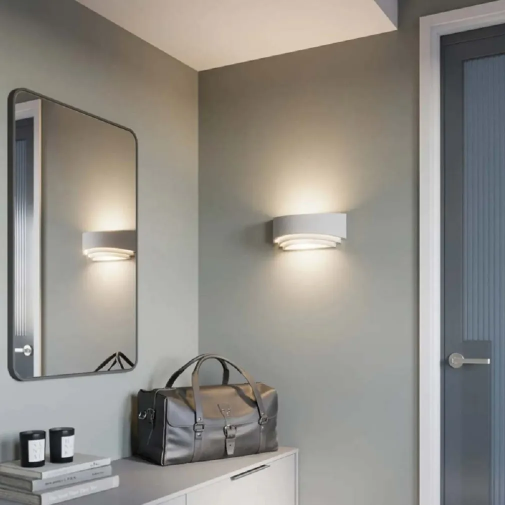 Lampada da parete decorativa, la cui versatilità la rende adatta a tutti gli interni. Struttura a mezzaluna concentrica che forma tre sporgenze diverse, aperte nella parte inferiore con delle fessure che creano un’illuminazione decorativa ed efficiente facendo sì che possa essere utilizzata in ogni ambiente. Dotata di doppia emissione di luce verso l’alto e verso il basso. A seconda dell’effetto desiderato, la lampada può essere lasciata nella versione colore originale (bianco) o verniciata del colore che si desidera.