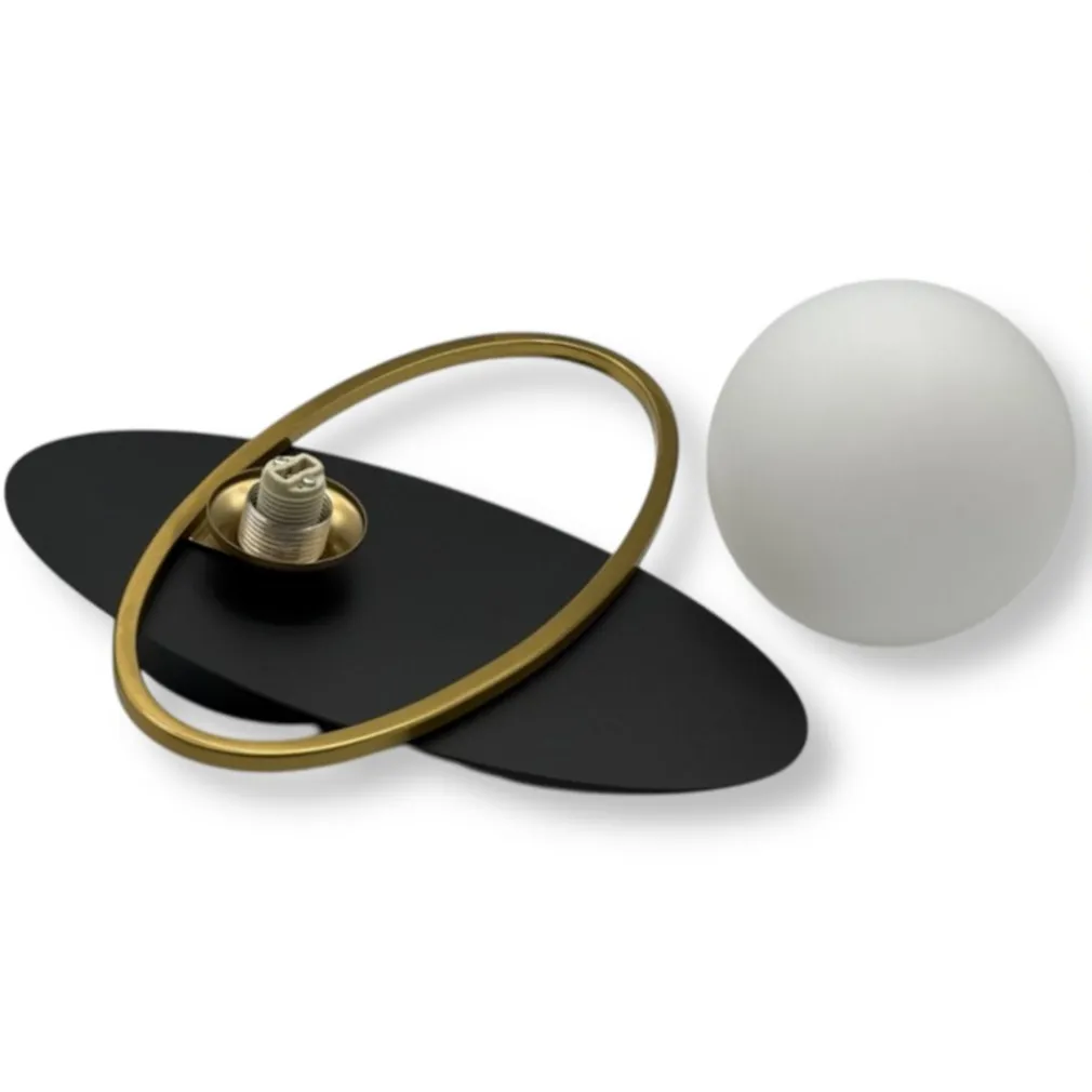 Combinazione di materiali esclusiva: base ovale nera, anello dorato e diffusore in bianco opalino.