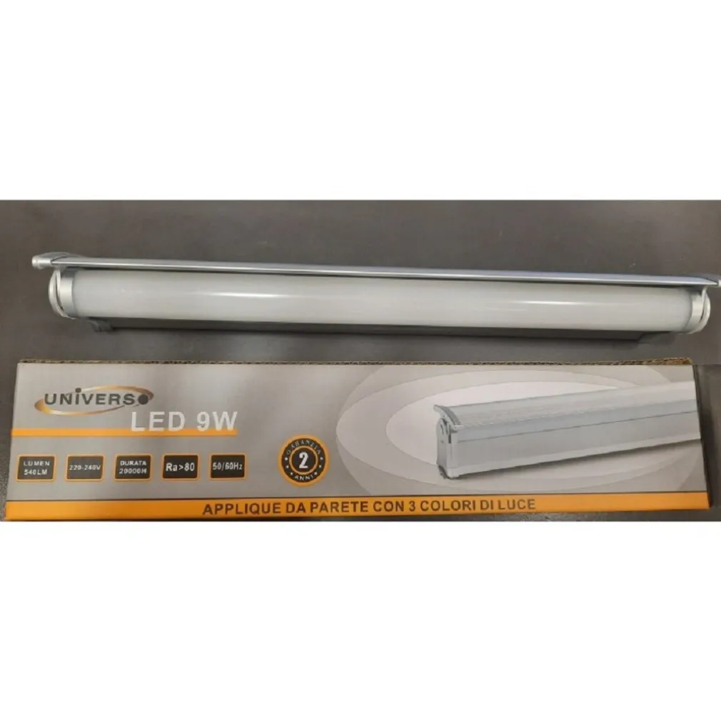 Applique lampada da specchio dal design lineare con fascio luminoso UP&DOWN, realizzata in alluminio e PC, potenza 9W, lumen 540Lm, lunghezza 31 cm, fascio luminoso 120°, colore Argento con copertina Bianco Latte. Valorizza i tuoi spazi con questa applique da specchio, perfetta sopra i pensili del bagno o sopra lo specchio. Ideale anche per l’illuminazione di vari contesti come toilette di locali, hotel, ristoranti. Questa lampada moderna è realizzata in alluminio e PC, emette una luce direzionabile. Applique da parete, ideale per lo specchio del bagno. Dotato di tripla accensione a luce calda, fredda, naturale selezionabili spegnendo e riaccendendo la lampada più volte.