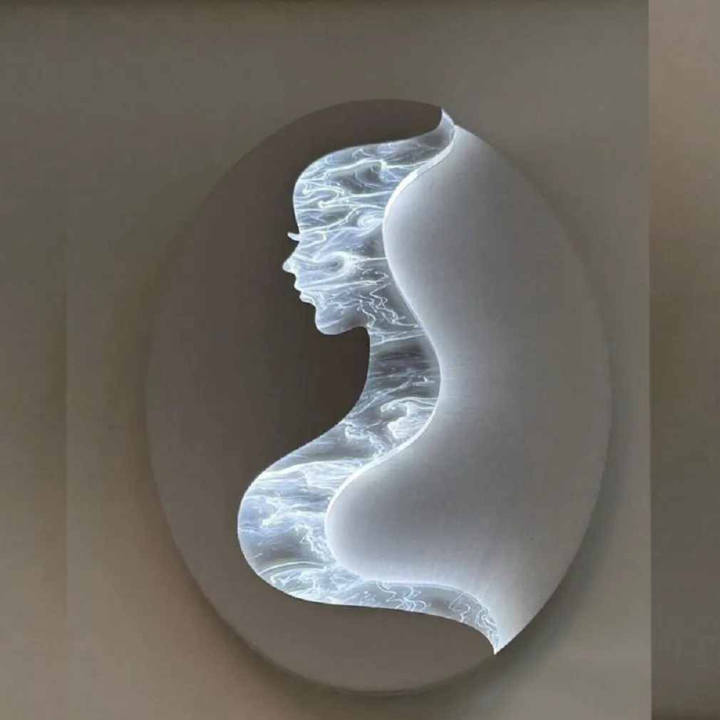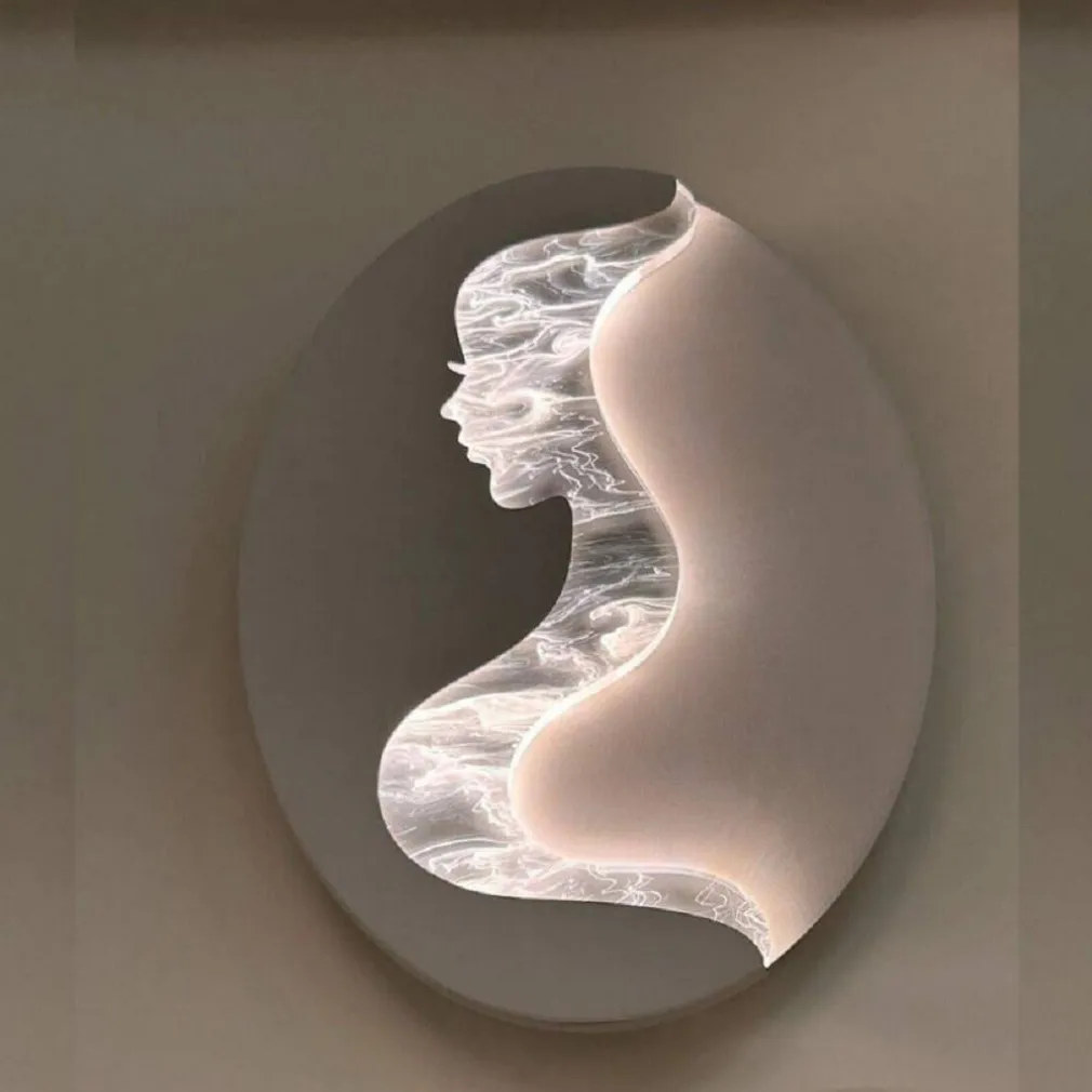 Applique a led per interno moderno ovale. Ideale per illuminare camere da letto, soggiorni, salotti, ingressi ed in tutti quei posti dove si vuole installare una lampada dal design stilizzato e moderno. La lampada integra una fascia di led che da acceso emette una luce centrale illuminando l’interno dov’è raffigurato il profilo di una donna. Dotata di tripla accensione a luce calda – fredda – naturale selezionabili tramite interruttore.