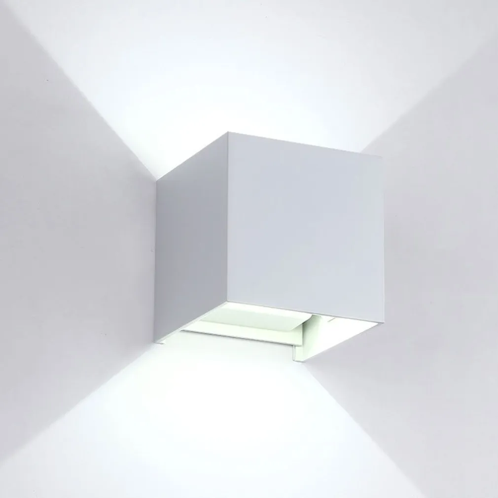 Applique da parete a led per ambienti interni ed esterni, certificato IP65, con struttura in metallo verniciato bianco ad alte temperature, quindi adatto alle intemperie. Il design si presenta come un classico cubo, a cui può essere tolto l’involucro in modo da poter regolare i fasci di luce emessi tramite le pratiche alette regolabili. Si può quindi decidere se avere un illuminazione ampia, ristretta, solo verso il basso, verso l’alto o da ambedue le parti, in modo da rendere questa applique davvero duttile e suggestiva. Il consumo è di soli 5W, grazie ai led integrati di ultima generazione che garantiscono prestazioni elevate, bassi consumi e alta affidabilità nel tempo. Il collegamento è diretto alla rete 220V, infatti l’alimentatore è già incorporato all’interno del faretto.