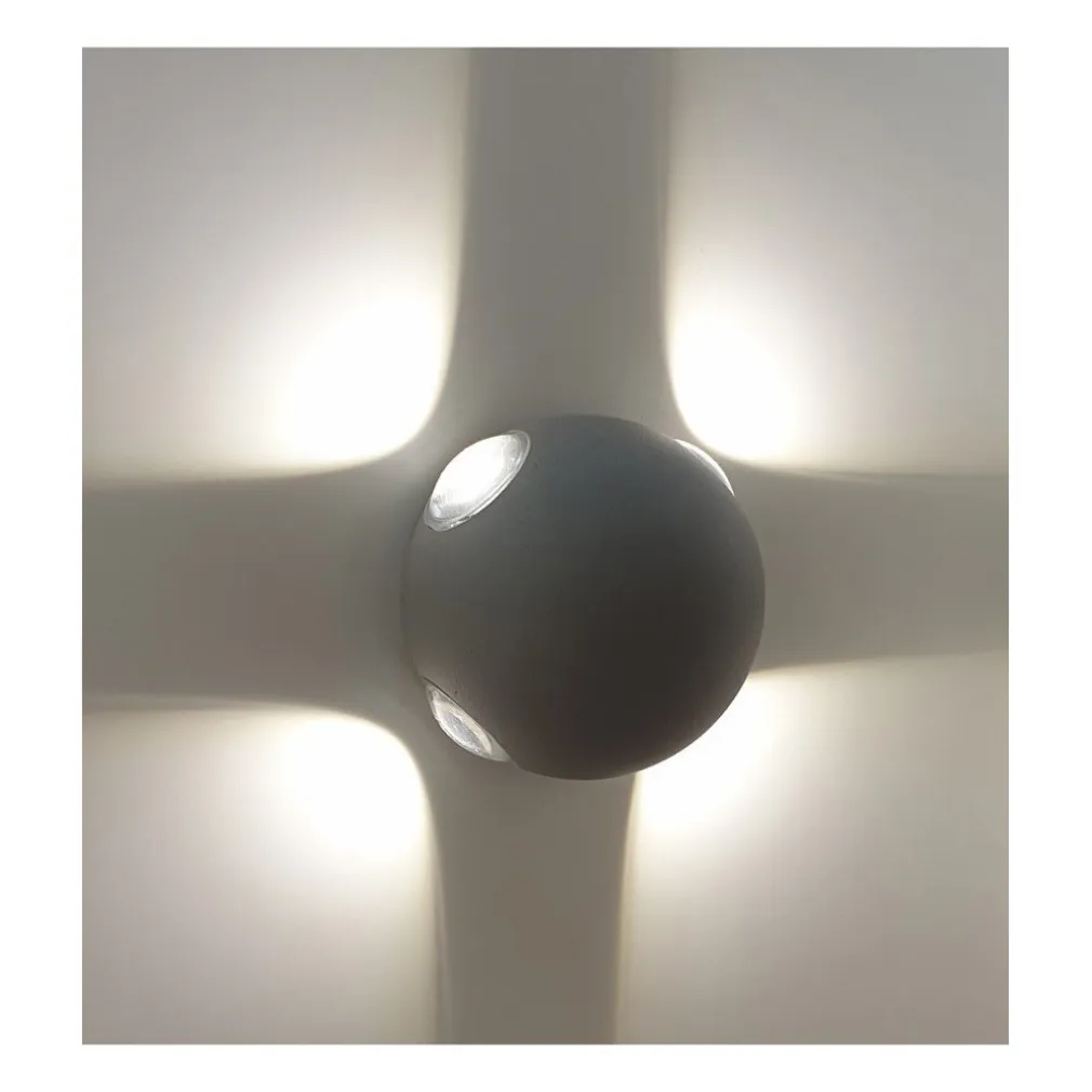 Applique sferico dal design moderno realizzato in alluminio adatto per uso esterno per installazioni a parete dotato di 4 LED con potenza 10W ideale per arredare i propri ambienti esterni come ingressi – corridoi – all’esterno di abitazioni – negozi – attività commerciali – garage – parcheggi – il proprio giardino. L’applique mette 4 fasci di luce in orizzontale e verticale formando una X o una croce secondo il tipo d’installazione. Ha un grado di protezione IP65 ideale per uso esterno resistente alle intemperie e gli agenti atmosferici. Non necessita di driver in quanto incluso, si alimenta direttamente alla rete a 230V. Il led integrato consente un notevole risparmio energetico. L’applique genera un flusso luminoso di circa 1200 lumen ed ha un angolo di luce diffuso di 180 gradi.